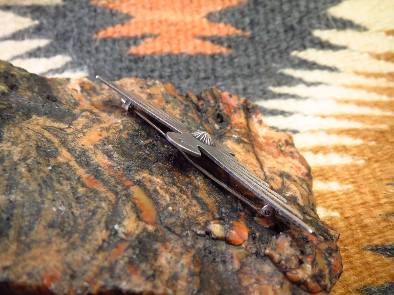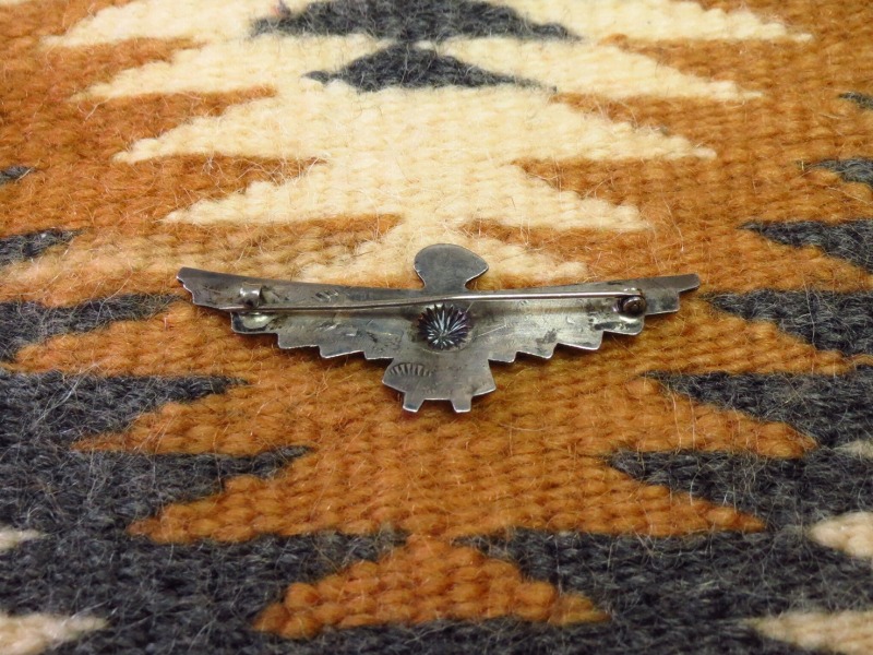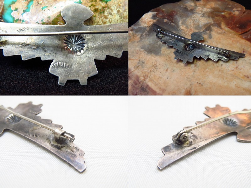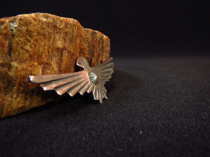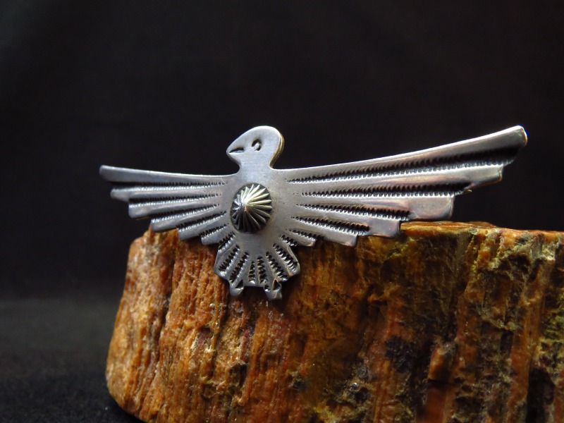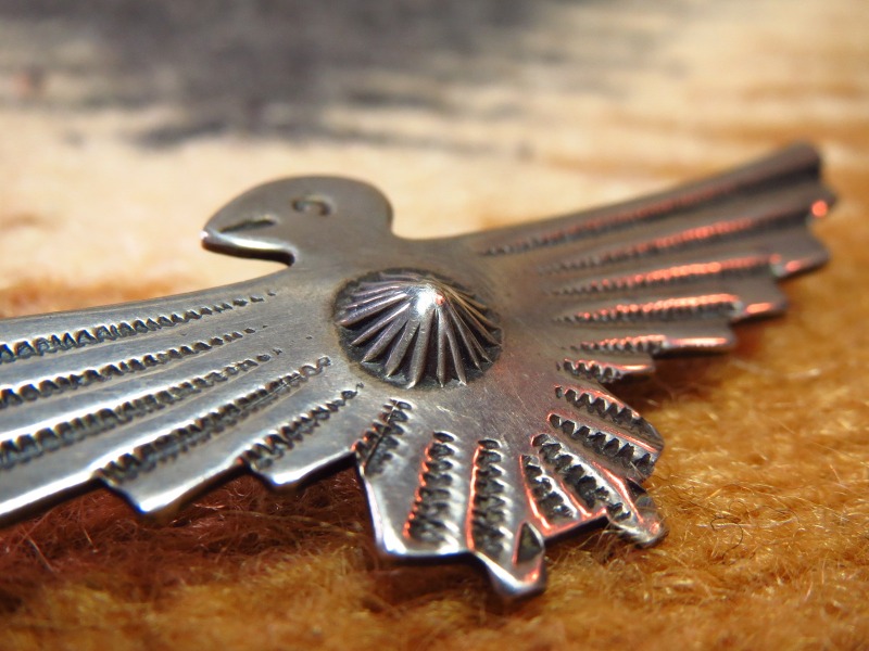 【Tourist Jewelry】ツーリストジュエリーや【Fred Harvey Style】フレッド・ハービースタイルと呼ばれる、20世紀前半頃にアメリカ中西部の観光客向けに制作されたスーベニアアイテム(土産物)の一つで、サンダーバードシェイプにリポウズやスタンプワークが施されたアンティーク/ビンテージピンブローチです。