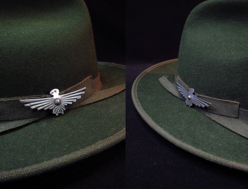 また、こちらの様なピンはアウターのアクセントととして、ラペルや襟等にもフィットしますし、独特な横長のシェイプも多くのアイテムにフィットさせやすく、ハット等のワンポイントにも使い勝手の良いピースです。