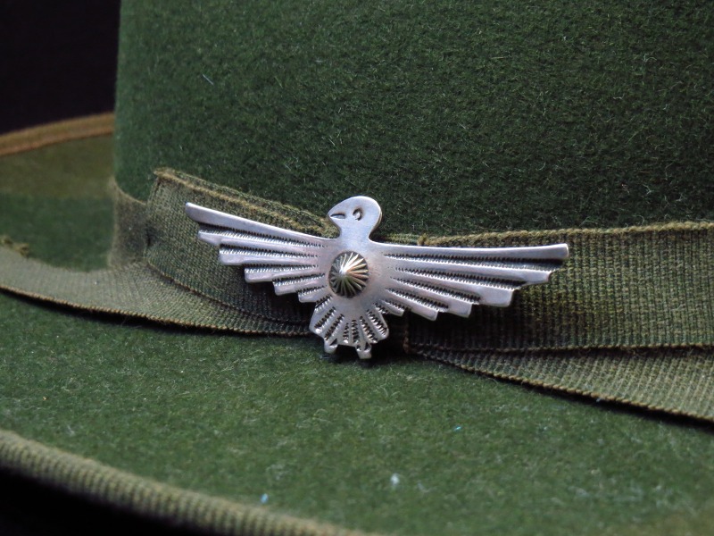 1930年代~1940年代製と思われ、ツーリストジュエリー/フレッド・ハービースタイルを代表するようなサンダーバードモチーフのピース。比較的シンプルで可愛いサンダーバードモチーフながら力強いシルバーワークで構成されています。