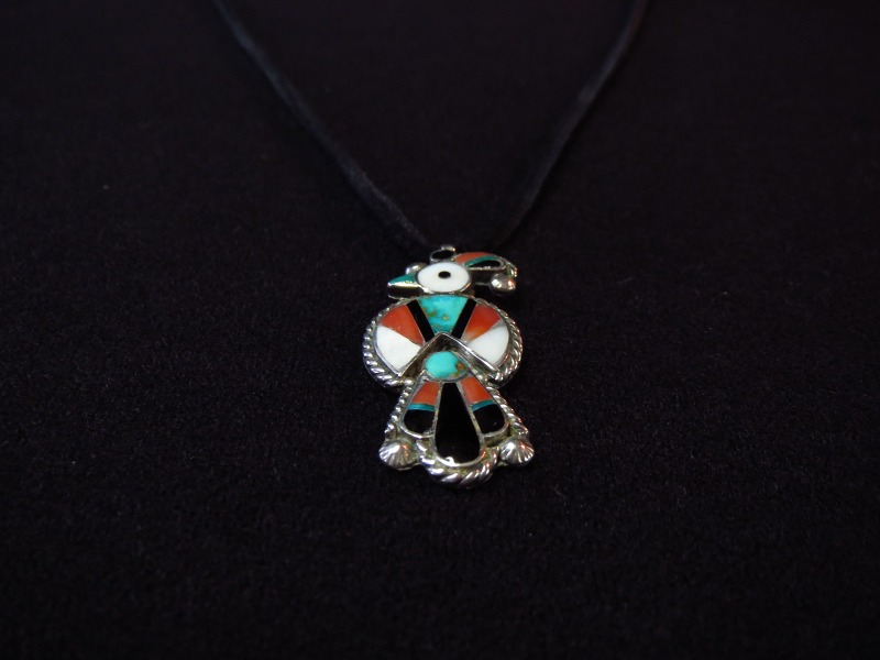【ZUNI】ズ二のアンティークジュエリー、サンダーバード/ホピバードのモチーフがチャンネルインレイで造形された作品で、ズニらしい多彩な素材をインレイすることで生み出される美しい色彩が特徴的なトップ。それを当店でディアスキンレザーレースにセットしたアンティーク/ビンテージネックレスです。