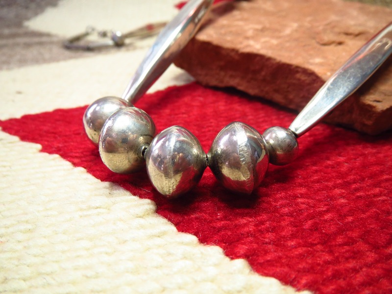 また、ナバホの伝統的なシルバービーズは現地において『Navajo Pearls/ナバホパール』(ナバホの真珠)と呼ばれることがありますが、まさにこちらの様なクオリティーと美しい仕上げによって作られたシルバービーズは、『Navajo Pearls』と呼ぶにふさわしい質と品位を持っています。現在では限られた作家しか作らないこちらのような完全なハンドメイドのビーズは、材料の加工からの全ての工程を手作業により作り上げられており、コンチョを作るような手法で半球体を制作し、それらを二つロウ付けすることでビーズに成形しています。そのため、その形状や大きさは不均一ですが、独特の味わいが感じられます。特にJoe H. Quintanaはシルバービーズのスペシャリストであり、氏が活躍した当時には唯一無二のクオリティーを誇っていました。
