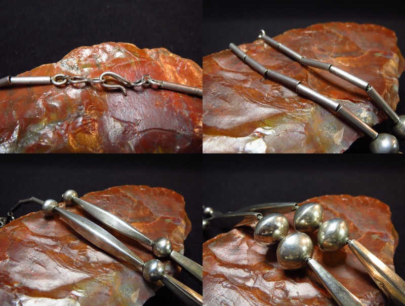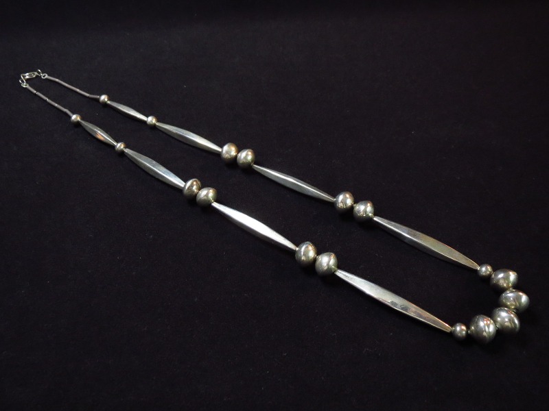 全長約78㎝程度と長さのあるネックレスで、シルバービーズも贅沢な大きさのあるビースが用いられているため、シャツの上からでもご着用いただける印象の作品。Joe H. Quintana氏が得意としたシルバービーズのみで構成されたネックレスで、現在は息子の【Cippy CrazyHorse】シピー・クレイジーホース氏が、同じ技術と造形、ツールも受け継ぎ、非常に類似したネックレスを制作しています。重量感や均一なクオリティーは、すでにCippy CrazyHorse氏が父親の作品を上回っています。 しかしながら、当店ではアンティーク/ビンテージのインディアンジュエリーをメインにしており、その制作上のムラやハンドメイド独特の個性を重視しています。