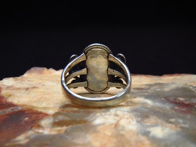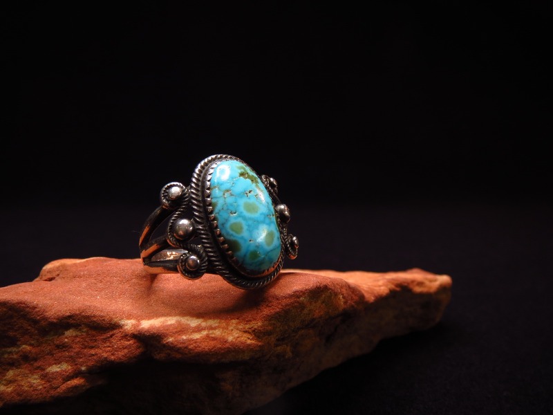 全てナバホの伝統的なディテール/技法によって造形されていますが、上記の様な上質で手の込んだシルバーワークと、ジェムクオリティーのターコイズがセットされることで際立った存在感と上質感をも感じさせるリングです。