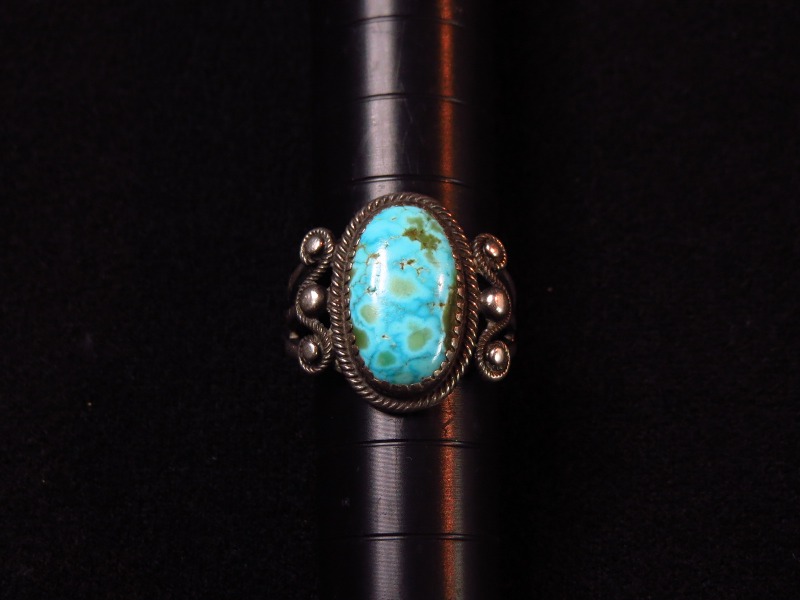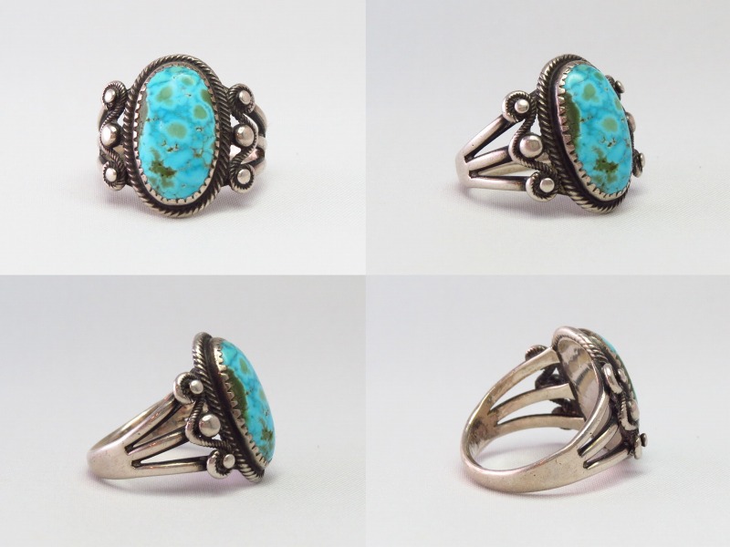 おそらくインゴットシルバー(銀塊)から成形されたシャンクは、フロントが『スプリットシャンク』と呼ばれる伝統的な造形で3本に割り開かれており、フェイスに向けて自然な流れを生み出しています。そこにカボションカットのナンバーエイトターコイズがセットされ、左右に施されたシルバードロップ/シルバーボールと石のベゼルには単独のスクエアワイヤーを捻ることで作り出すツイステッドワイヤーが配されており、独特な装飾によって有機的で武骨な表情が与えられています。