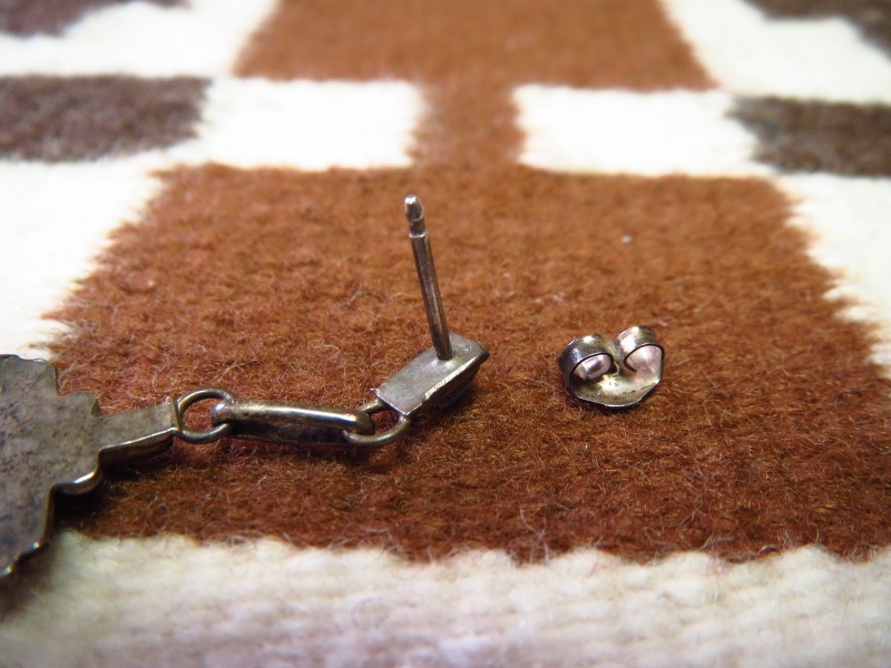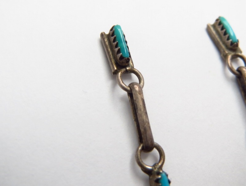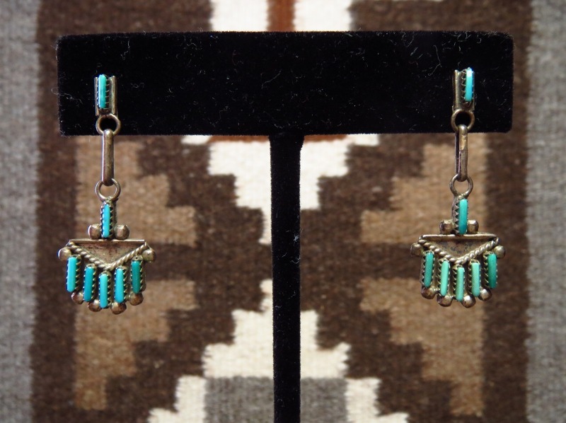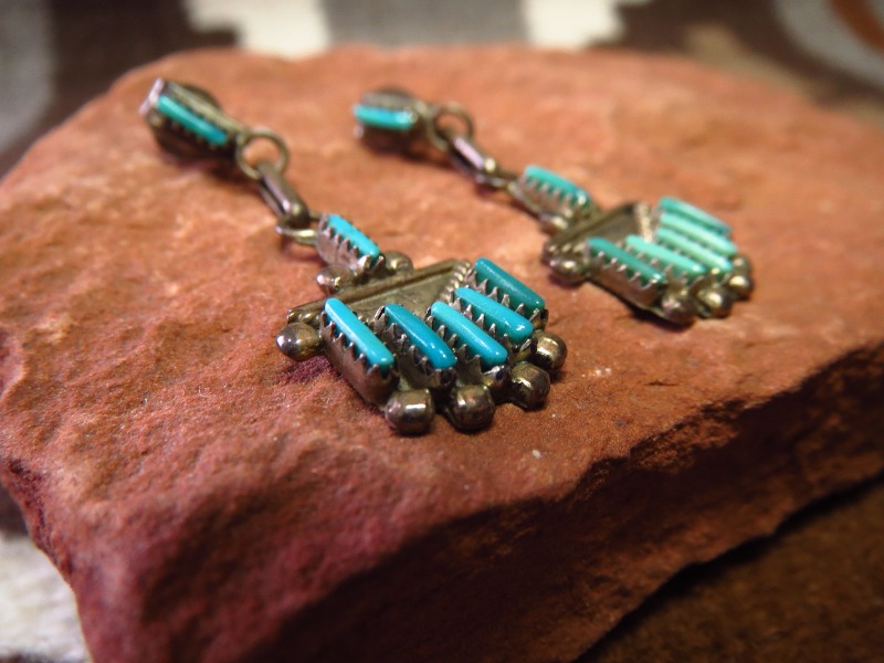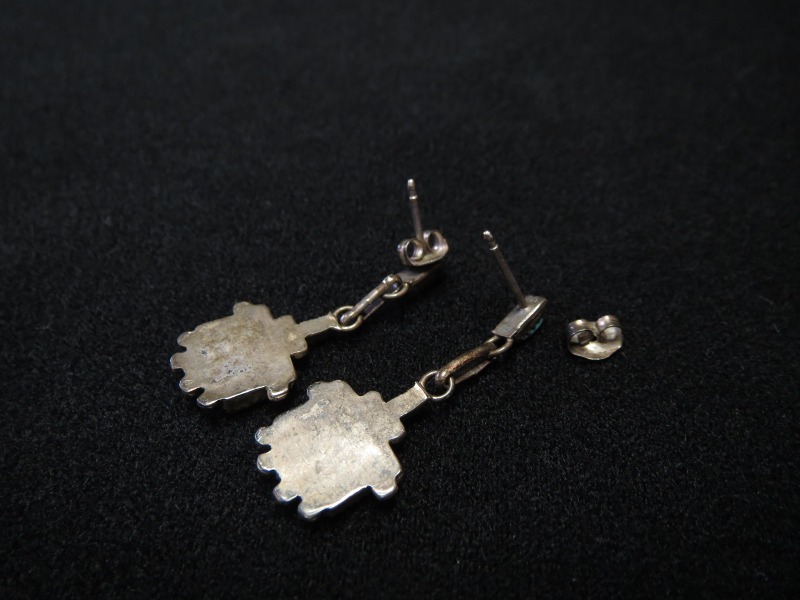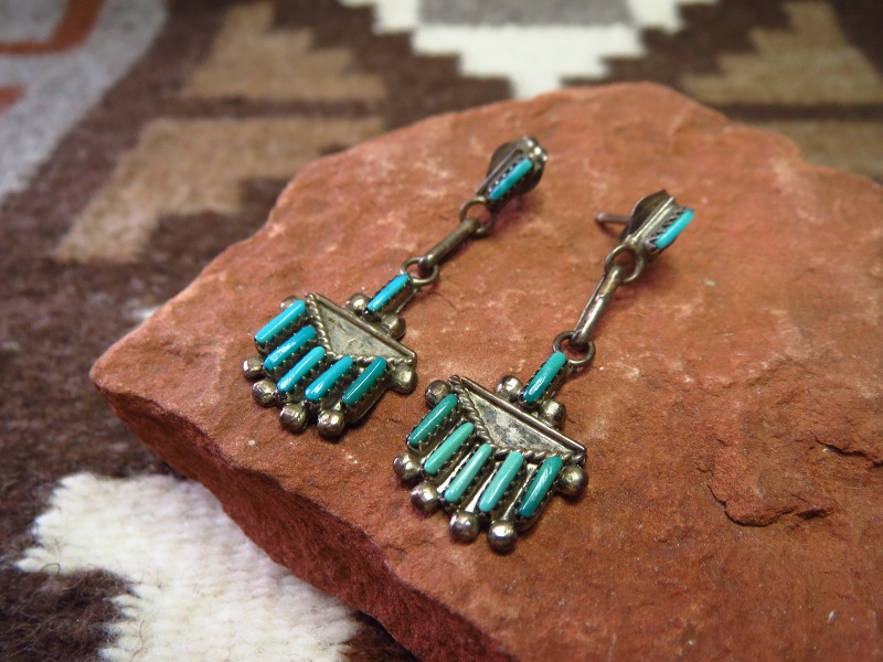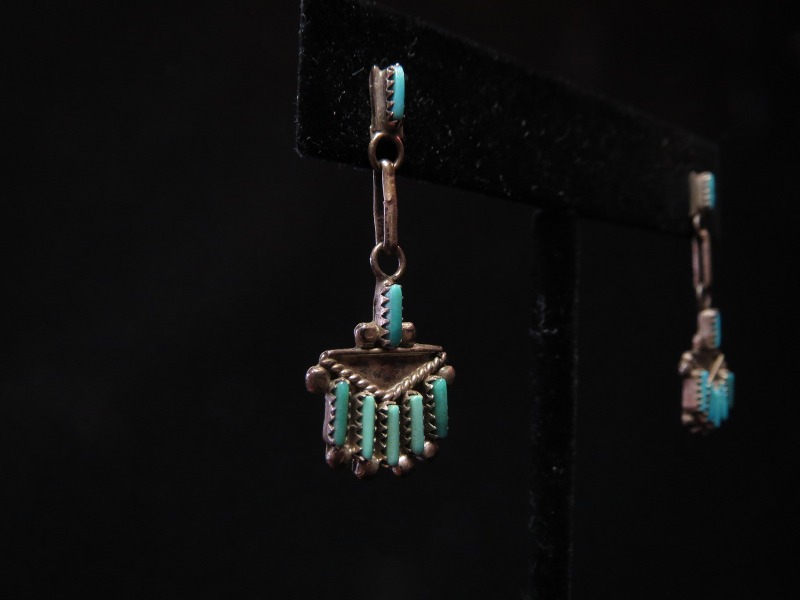 【ZUNI】ズ二のビンテージジュエリー、伝統的な造形技術の一つである『Needle Point/ニードルポイント』と呼ばれる技法によって、とても小さなターコイズが配された作品。ズニ独特の繊細で美しい表情を見せる造形/デザインが印象的なダングルタイプ(吊り下げ)のビンテージピアスです。