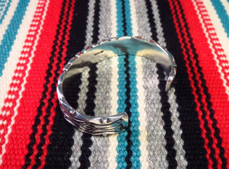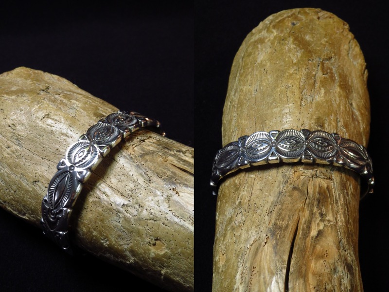 同作者が制作した多くのブレスレットで使用しているシルバーゲージよりも少し分厚い9ゲージ(2.90㎜)のシルバーをベースにし、1/2inch幅ながら重量約51gで、とても心地よい重量感を持ったバングルです。スタンプワーク等のデザインは、前述の通りFred Peshlakaiの作品を元にしていますが、忠実な再現ではなく独自の解釈で再現して欲しいと依頼しており、圧倒的なクリエイティビティーと技術を誇ったFred Peshlakaiのデザイン/造形に、Clendon Peteのセンスと美しいシルバーワークによる完成度が付加されているようです。