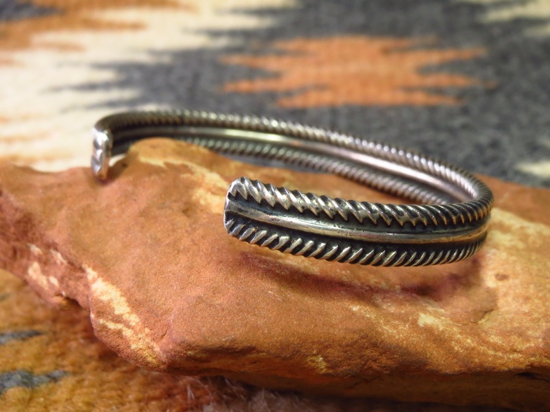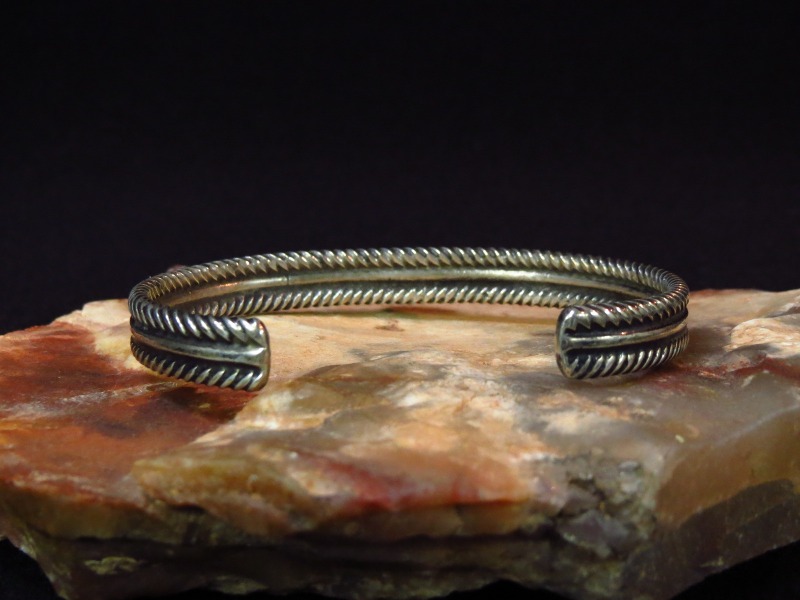 伝統的なスタイルや技術を踏襲した作品ながら大変完成度が高く、作者の卓越した造形センスを感じさせる秀逸なデザイン。ナローなバングルですが、プリミティブな製法と武骨な印象も持っており、ナチュラルで違和感なく手首にフィットします。