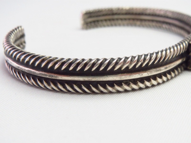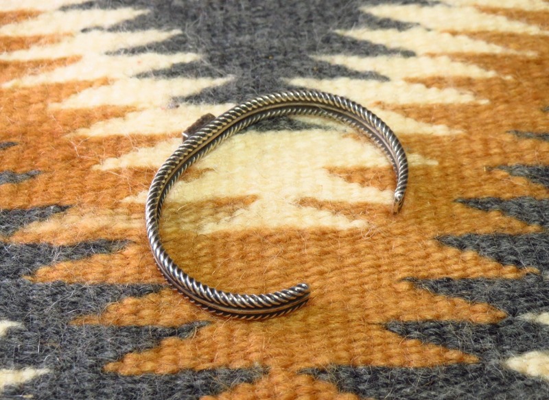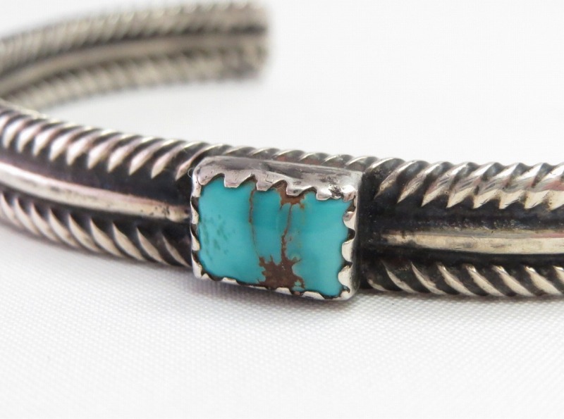 1940年代後半~1950年代の作品と思われ、ナバホジュエリーの伝統技法であるツイステッドワイヤーのシンプルながら味わい深い質感を生かした作品。上下2本のツイステッドワイヤーは、単独のスクエアワイヤー(断面が正方形のシルバーワイヤー)を捻ることで作り出しており、中央にラウンドワイヤーを挟み込んで、3連のデザイン/造形に構成しています。そして、中央には小粒ながら作品に奥行きとアクセントを与えるスクエアカットのターコイズがセットされており、アンティークピースでありながら現代的でエッジーな表情を持った作品です。