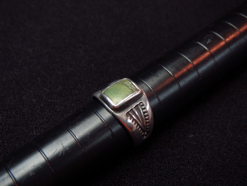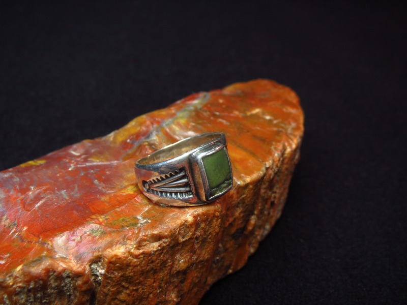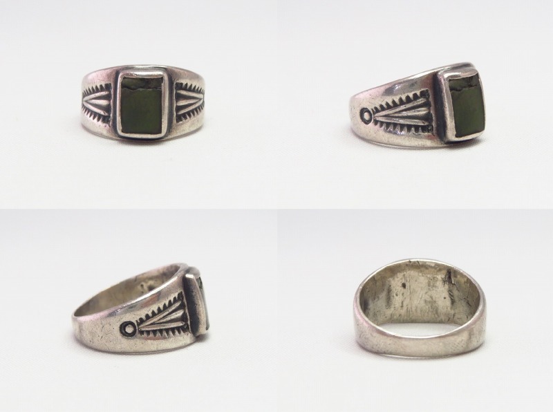 シャンクはセンターが少し広くなったクラシックなシェイプで、センターにスクエアカットの渋いグリーンターコイズがセットされています。もちろんベゼルもハンドメイドで形作られており、分厚いシルバーを用いたベゼルとなっています。さらに、サイドにはアンティーク作品らしいプリミティブな印象のスタンプが力強く刻まれています。原始的な技術を用いていますが、完成度の高いシルバーワークで構成されており、スタンプ(鏨)やベゼルのディテール、その製法から1930年代初頭までに制作された作品と推測されます。