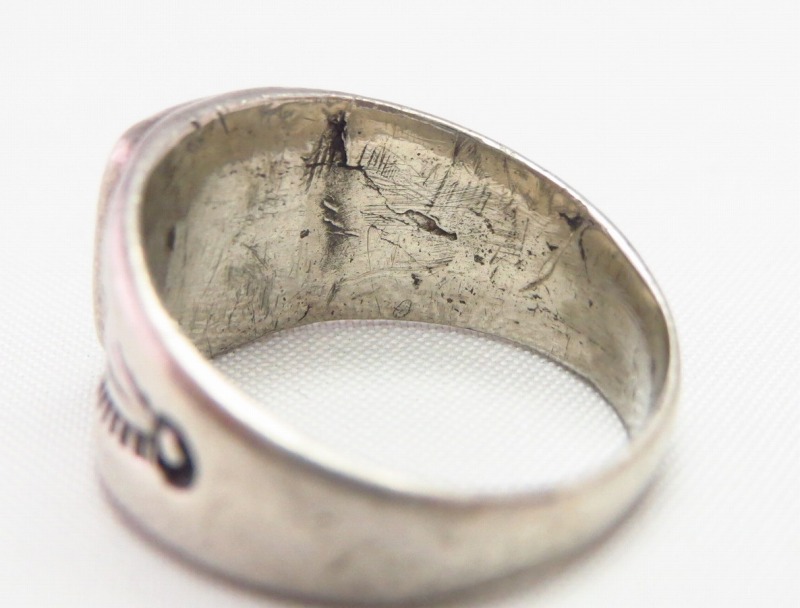 全てプリミティブな技術によるハンドメイドで仕上げられ、シャンクはインゴットシルバー(銀塊)からハンマーワークによって成形されています。リングの場合には、キャストで成形された作品もシルバープレートを使用して制作されたものでも、長期の着用によって摩耗が激しい場合には、その製法を推測するのが困難ですが、こちらのリングは内側の細かな亀裂(制作上の特徴)によってハンマーワークによってインゴットシルバーから成形されたことが分かります。