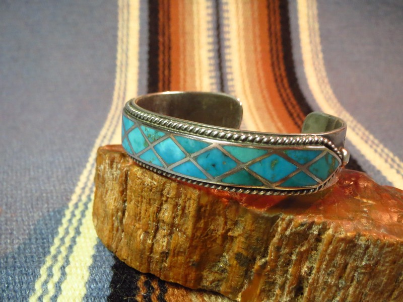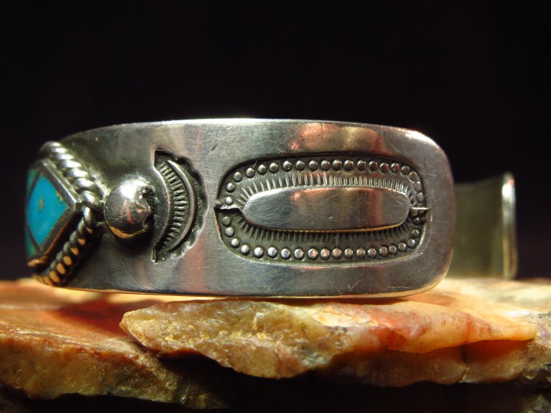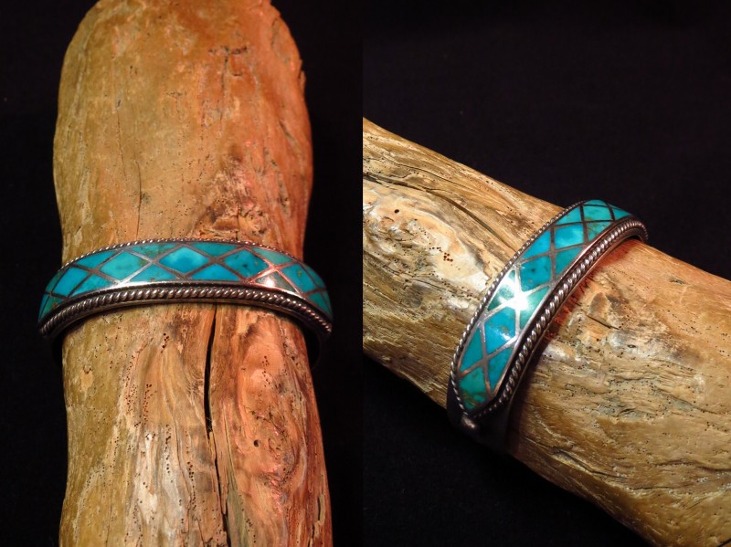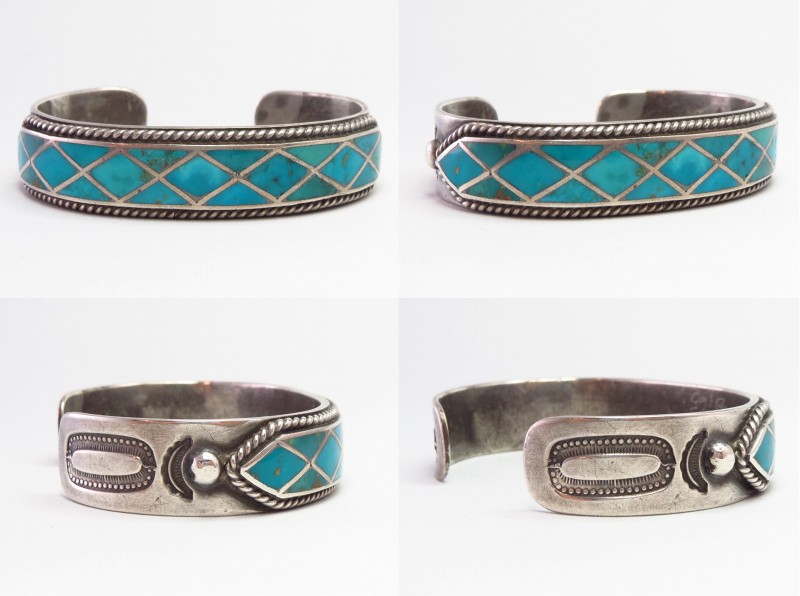 アンティーク作品ですが、今も新鮮な印象を受ける洗練された造形のバングルであり、ターコイズインレイがメインに構成されたバングルは無数に制作されていますが、こちらの作品に類似したものはほとんど現存しておらず、とてもコレクタブルでミュージアムに収蔵されていても不思議のない作品の一つとなっています。