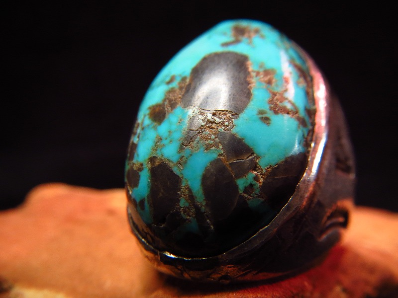 とても大きく、ドーム型にカボションカットされたターコイズがセットされています。とても長い年月を経てハイグロスではなくなっていますが、現在も変色せずに美しい水色を保ち、強い黒のマトリックスがワイルドに入る素晴らしいターコイズです。