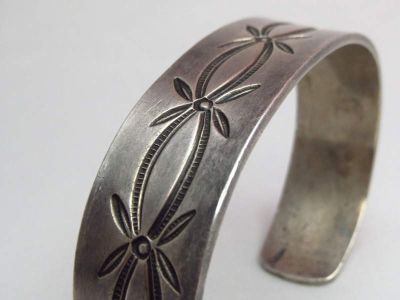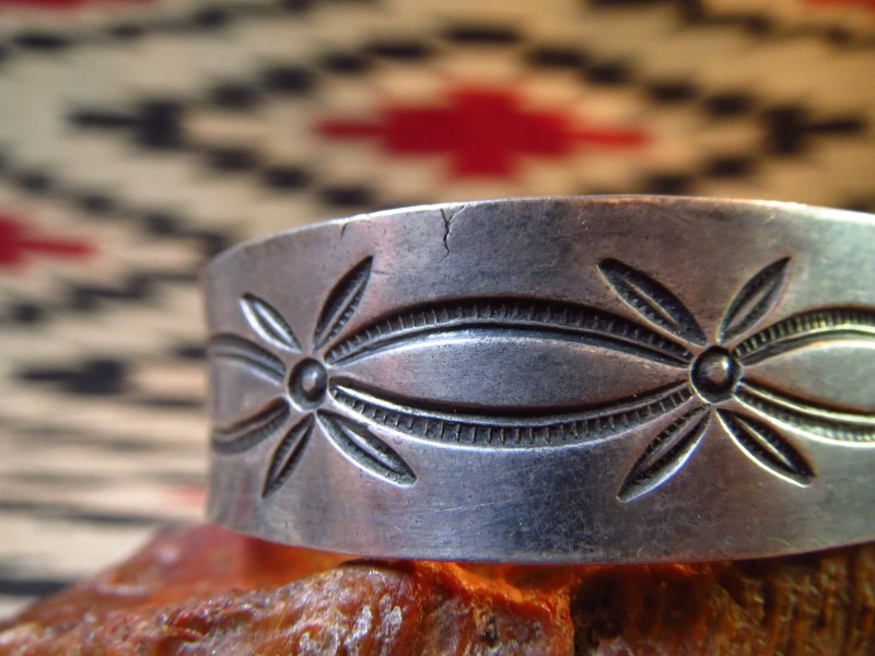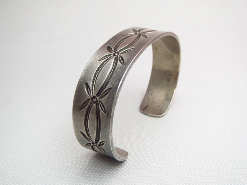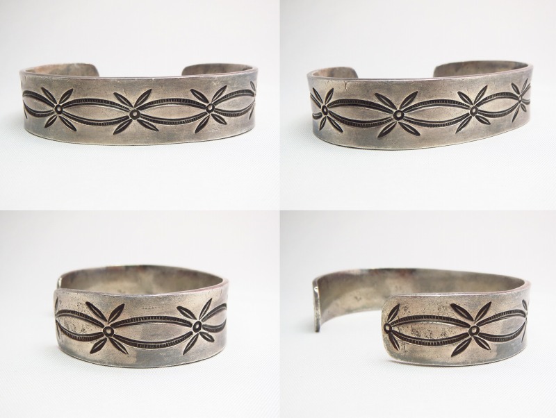 製法やディテールからおそらくナバホのシルバースミスによる作品と思われますが、シンプルなスタンプワークの構成はプエブロ(ナバホ以外のアメリカ中西部に起源を持つインディアン部族) の作品も想起させる雰囲気を持っています。