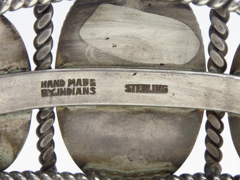 内側に刻印されている『HAND MADE BY INDIANS』と『STERLING SILVER』の表記により1930年代末頃~1940年代に同トレーディングポストで作られた作品と思われます。