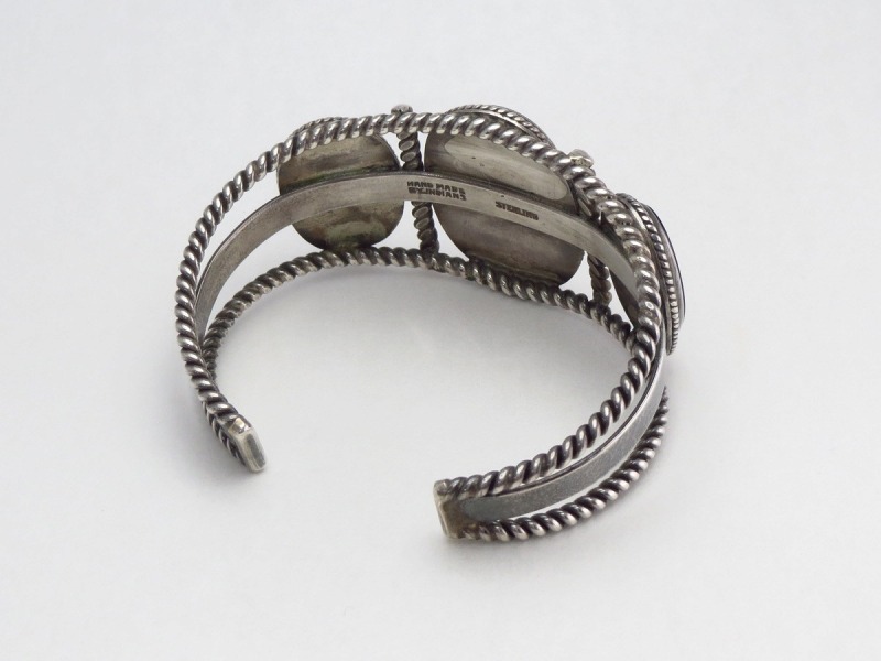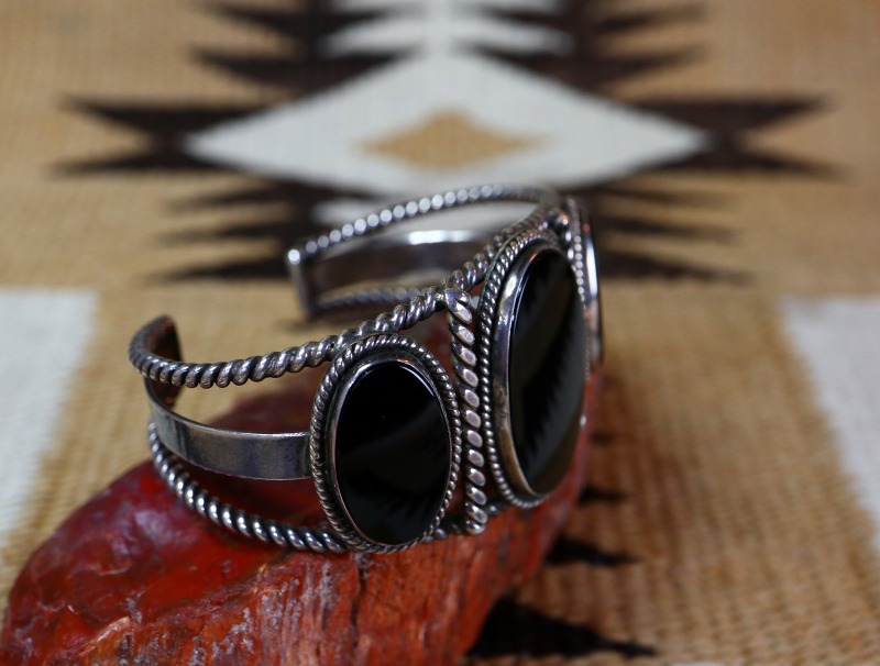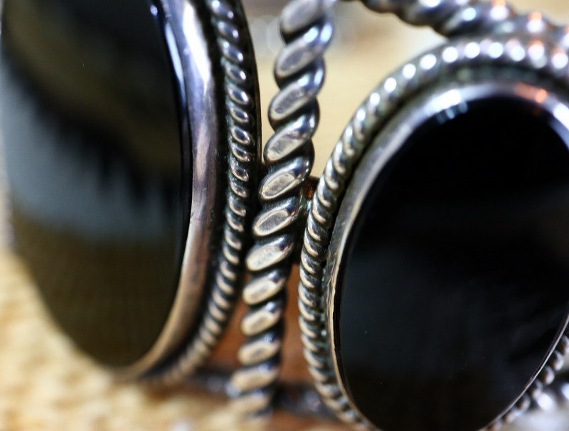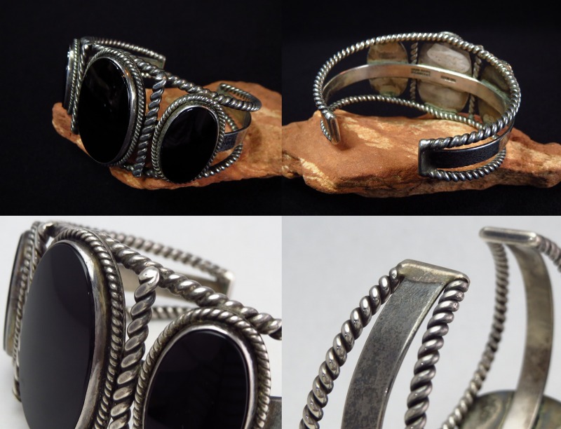 2本のシルバーワイヤーを撚り合わせてできたツイステッドワイヤーを上下に、おそらくインゴットシルバー(銀塊)から成形されたフラットなワイヤーを中央に配し、3連のバンドを構成しています。そこに3つのオーバルカットオニキスがセットされており、ベゼルや石と石の間にもツイステッドワイヤーが施されています。ソリッドな石とツイステッドワイヤーで構成されることで、シックで落ち着いた質感を醸し出しているようです。また、石の間に配されたツイステッドワイヤーは、ハンマーで叩くことで少しフラットに成形されています。こちらのようなハンマーワークと組み合わされたツイステッドワイヤーの造形は、それだけでも高い熟練度が必要で、ハンドメイドのインディアンジュエリー独特の味わいと技術力を感じることのできる造形スタイルです。また、均一なクオリティーに仕上げるのが難しく、ほとんど見られなくなった技術の一つであり、現代では【Tahe】タヒファミリーやコチティのベテラン作家の【Cippy CrazyHorse】シピー・クレイジーホース、ナバホの【Perry Shorty】ペリー・ショーティー等、限られた作家しか用いることのない技術になってしまいました。