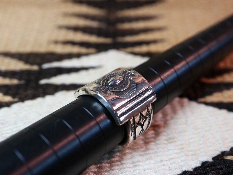 一つ一つのクオリティーが高いスタンプ(鏨)により力強く刻まれたスタンプワークやプリミティブなシルバーワークにより、ナバホジュエリーらしく奥行きのある表情に仕上がられています。
