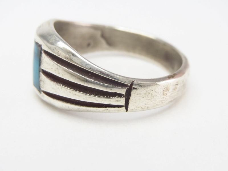 【NAVAJO】ナバホのビンテージジュエリー、キャストで成形された力強い造形をベースに、少しスモーキーで美しい透明感を持ったスクエアカットビズビーターコイズがインレイされた作品。エッジーでミニマルな造形美を持ったメンズサイズのアンティーク/ビンテージリングです。
