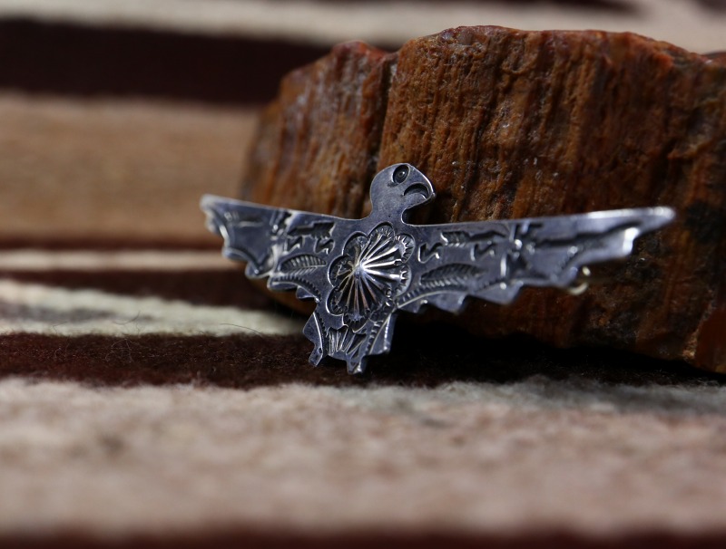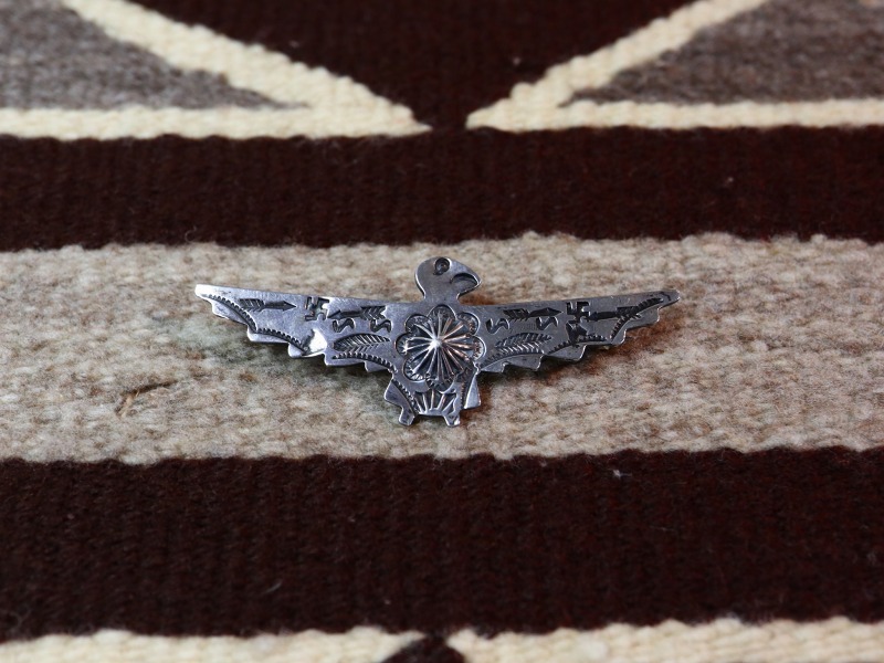 【NAVAJO】ナバホのアンティークジュエリー、おそらくインゴットコインシルバー(銀塊)から成形された地金をベースに、【逆卍】Whirling Logやアロー等、色々なスタンプワークが刻まれたサンダーバードシェイプが印象的なアンティーク/ビンテージピンブローチです。
