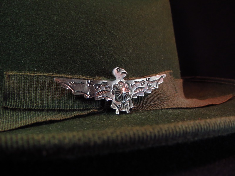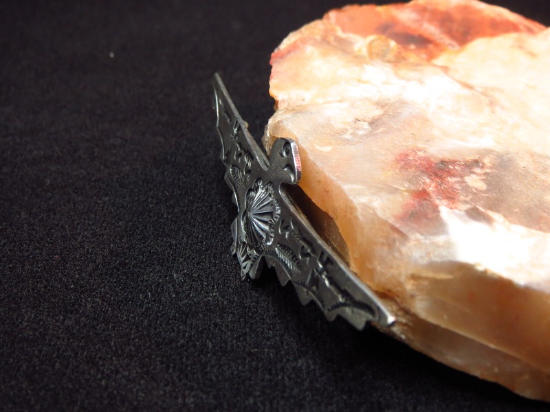 1920年代末~1930年代頃のピースと思われ、おそらくインゴットシルバー(銀塊)から成形された地金のシルバーは、機械によるプレスではなく手作業により特徴的なサンダーバードのシェイプにカッティングされており、武骨なスタンプワークによって細部が描き出されています。そして、細かな動きのあるサンダーバードシェイプの中央には鏨(鉄製の金型ツール)の凸と凹を用いてシルバーを叩きだすことで立体的な凹凸を作る『リポウズ』という技術によってシェルコンチョが表現され、細部にもこだわったシルバーワークにはハンドメイドの味わいが感じられます。卍やアロー等多くのモチーフの力強いスタンプワークが施されることで躍動感が感じられ、可愛い表情とのギャップも楽しいピースです。