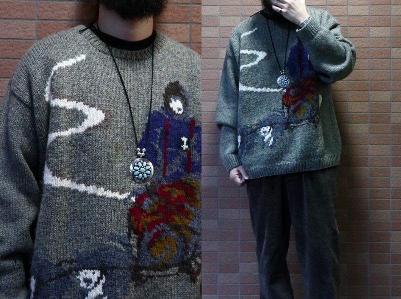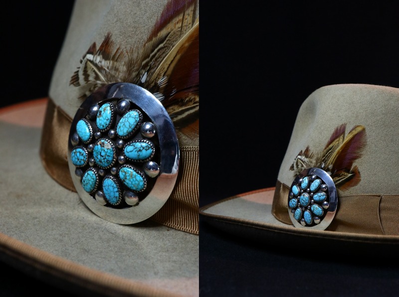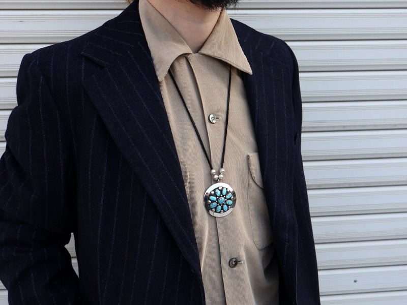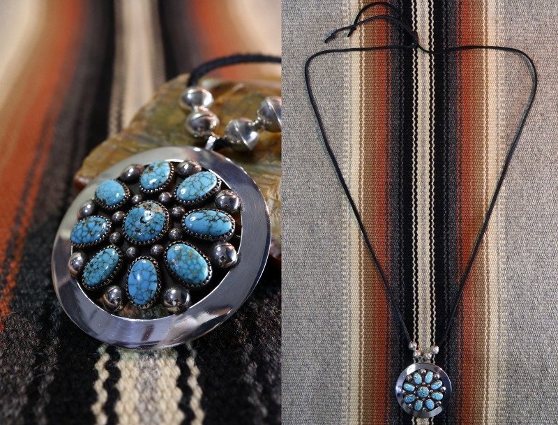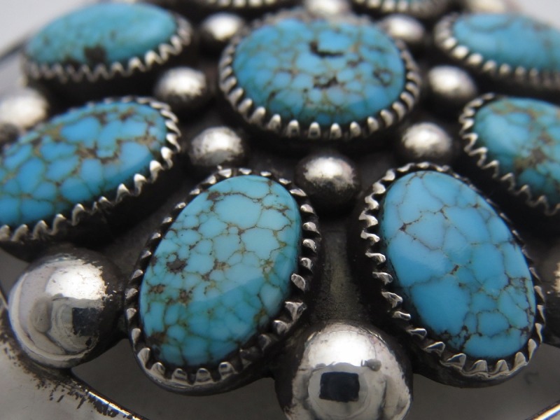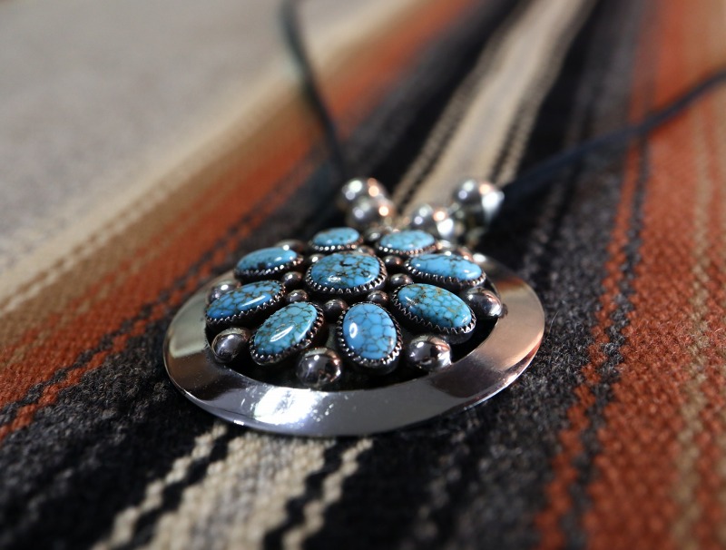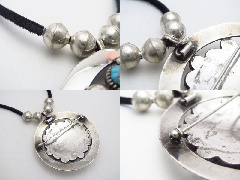 1950年代中頃~1960年代頃に作られた作品と思われ、リング状のペンダントトップに『クラスター』と呼ばれる放射状にターコイズを配した美しい作品で、その石の間には大小のシルバーボールが16個も施されています。このような造形スタイルは1930年代以前からみられる伝統的なデザインの一つで、バースト状(放射状)に石を配置することにより、ターコイズの美しさを際立たせ、大きな石の作品以上にターコイズの存在感を重視した造形です。またさらに、こちらのペンダントトップは全体にも丸太に彫り込んだ窪みにシルバーを叩き添わせることにより、立体的で柔らかいアール/曲面が作られており、フラットなシェイプよりも美しく、奥行きと力強い存在感のある造形を作り上げています。