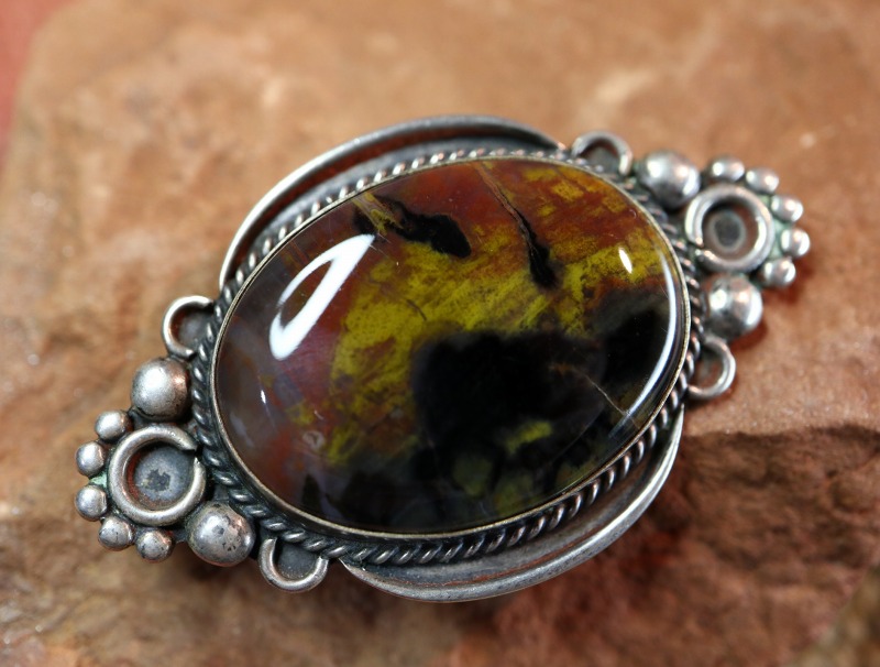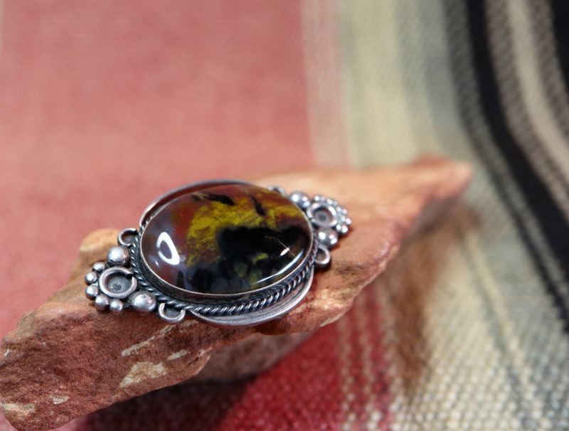 1940年代~1950年代頃に作られた作品と思われ、レインボーカラーと呼ばれるマルチカラーが美しいペトリファイドウッドがメインに構成された作品。オーバルシェイプのベゼル(覆輪)を囲むようにツイステッドワイヤーが施され、さらに繊細なワイヤーワークによる装飾が配されています。このような装飾に見られる造形スタイルは、1920年代~1940年代に活躍したシルバースミスによって生み出され、ツーリストジュエリーでは類似した装飾パーツが量産されました。本作では細かなシルバードロップやワイヤーワークがすべて手作業によって構成されており、味わい深い表情が与えられています。