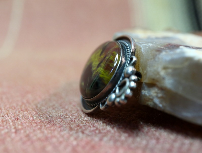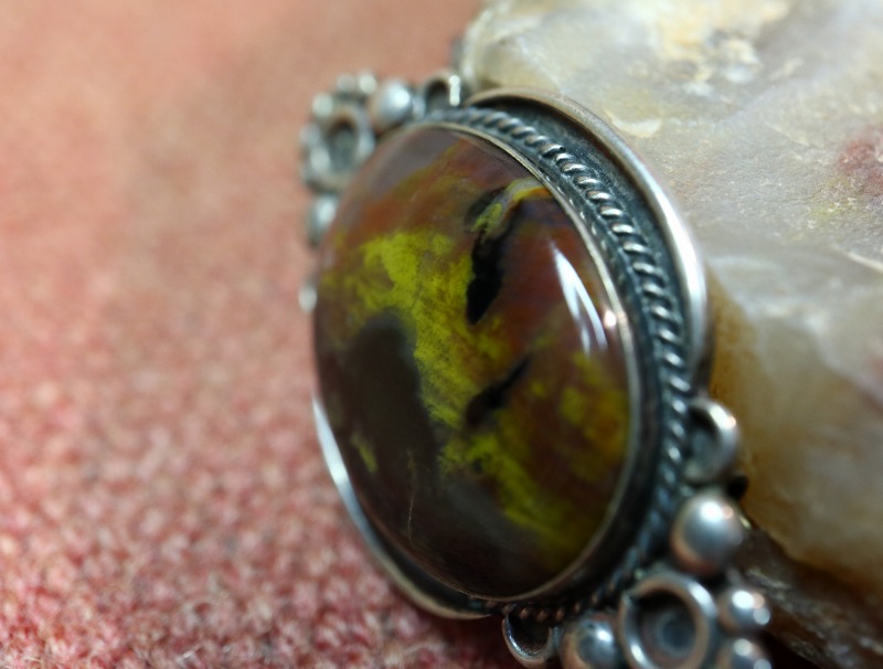 こちらの作品にセットされたペトリファイドウッドもインディアン居留地に近い場所で産出したものと思われ、イエローやパープル、強く深いブラックによって少し妖しげなマルチカラーが構成されています。さらに、高さのある贅沢なオーバルシェイプにカットされ、クウォーツ(水晶)が入ることで強い透明感も感じられます。アンティークジュエリーらしい渋い質感のシルバーと素晴らしい調和を見せ、抽象画の様にも見える美しく豊かな表情を持ったペトリファイドウッドです。