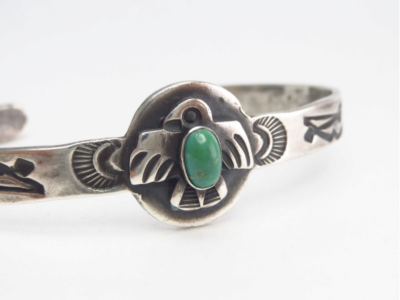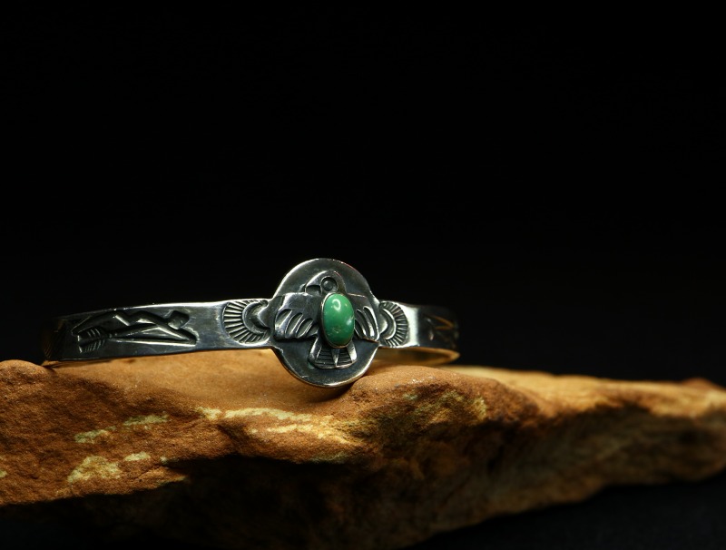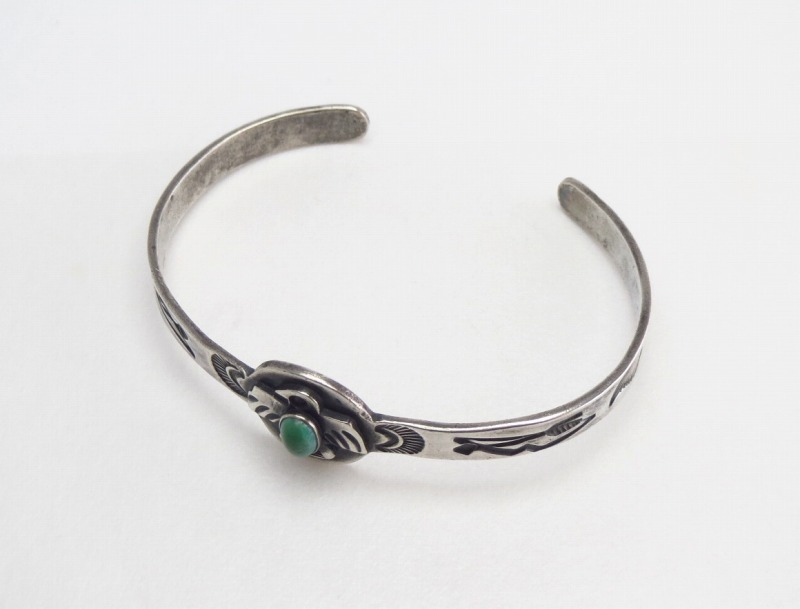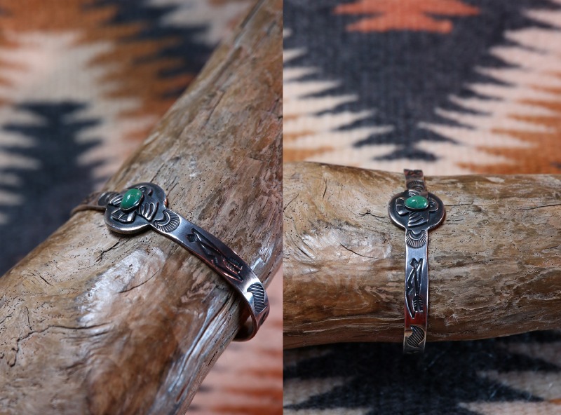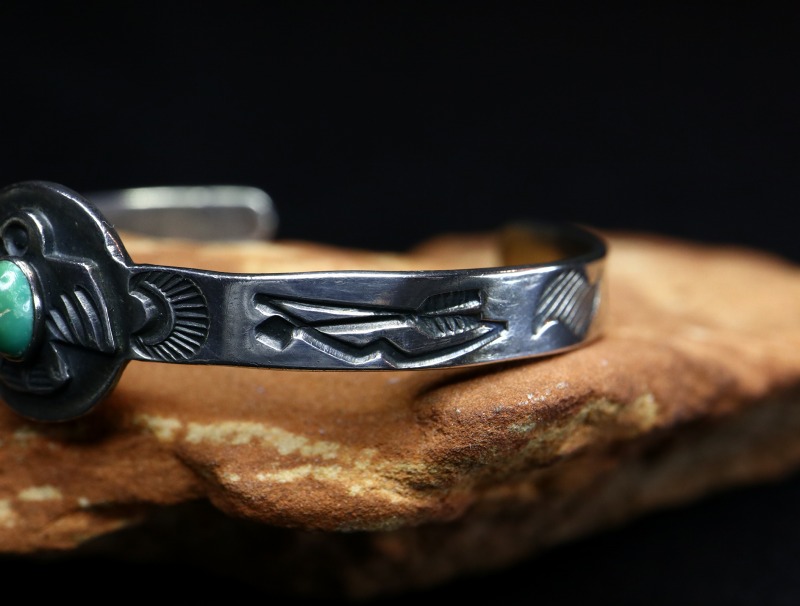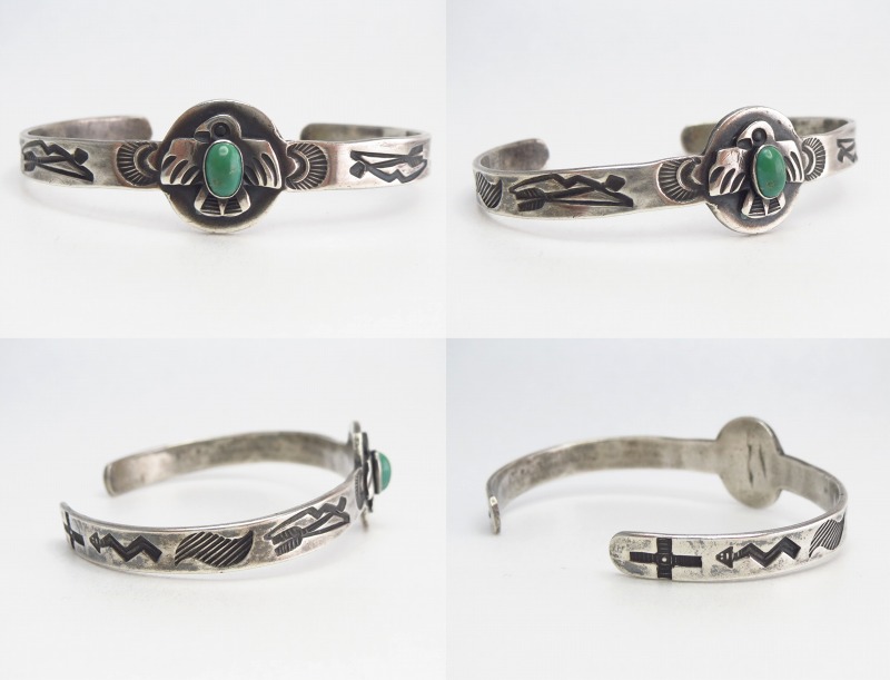 1930年代~1940年代製と思われ、ナローなバンドのセンター部分が丸いシェイプに造形されており、そこにサンダーバードのアップリケ/パッチワークが施されています。その中央にはナチュラルなグリーンターコイズがセットされ、フロントからターミナル(両端)までボー&アロー(弓矢)やライトニングスネーク、コヨーテトラック(足跡)等のツーリストアイテムらしいスタンプワークが刻まれることでとてもキャッチーな印象に仕上がっています。