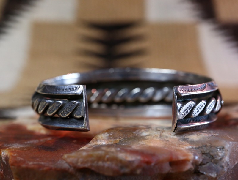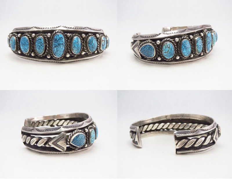 1950年代前後の作品と思われ、トライアングルワイヤーに挟まれるようにターコイズがセットされています。バンドのベースは、上下のトライアングルワイヤーだけでなく、中央に2本のワイヤーを撚り合わせてできたツイステッドワイヤーをハンマーで叩くことでフラットなシェイプに成形したワイヤーが配され、非常に手の込んだシルバーワークも特徴的な作品です。また、それぞれのワイヤーにはスタンプワークが刻まれ、両サイド部分には三角形のコンチョがアップリケ/パッチワークされています。また、ターコイズのベゼル(覆輪)にはそれぞれツイステッドワイヤーが施されており、石と石の間には16個もの小さなシルバードロップ/ボールが配されています。さらに、ターミナル部分に小さなタブパーツが備えられており、バンドを構成する3本のワイヤーがしっかりとまとめられています。伝統的でプリミティブな技術を駆使したシルバーワークですが、細部まで美意識を感じさせる造りとなっています。