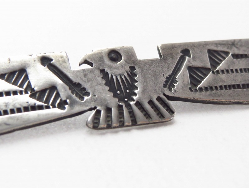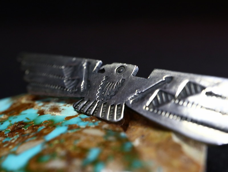 おそらくインゴットシルバー(銀塊)から成形された地金のシルバーは、機械によるプレスではなく手作業により特徴的な細長いサンダーバードのシェイプにカッティングされており、クチバシの部分など細かな仕事が施されています。さらに、力強いスタンプワークを刻むことによってサンダーバードの顔等、細部が描き出されています。