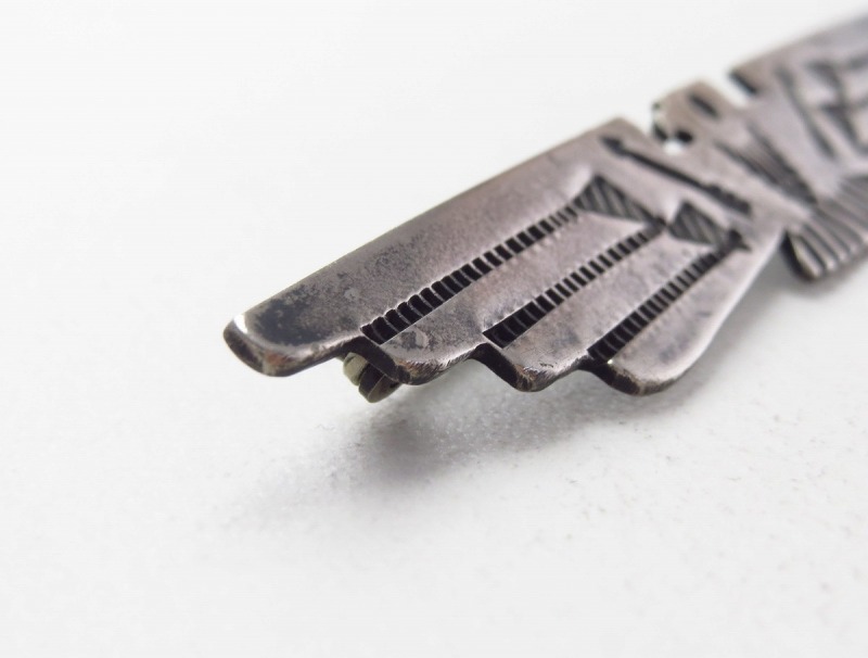【NAVAJO】ナバホのアンティークジュエリー、ツーリストアイテムとしてオーセンティックなアイテムながら素晴らしい造形センスを感じさせる作品。横に長くバー状のサンダーバードシェイプが特徴的なアンティーク/ビンテージピンブローチです。