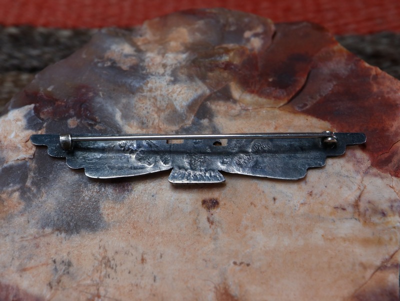 キャッチーな印象を持つサンダーバードモチーフですが、インゴット(銀塊)から成形された地金や武骨なスタンプワークなど、ナバホの伝統的な技術やハンドメイドの味わいが感じられるピース。前述のカタログにおいても『This is our best selling brooch』と紹介されています。