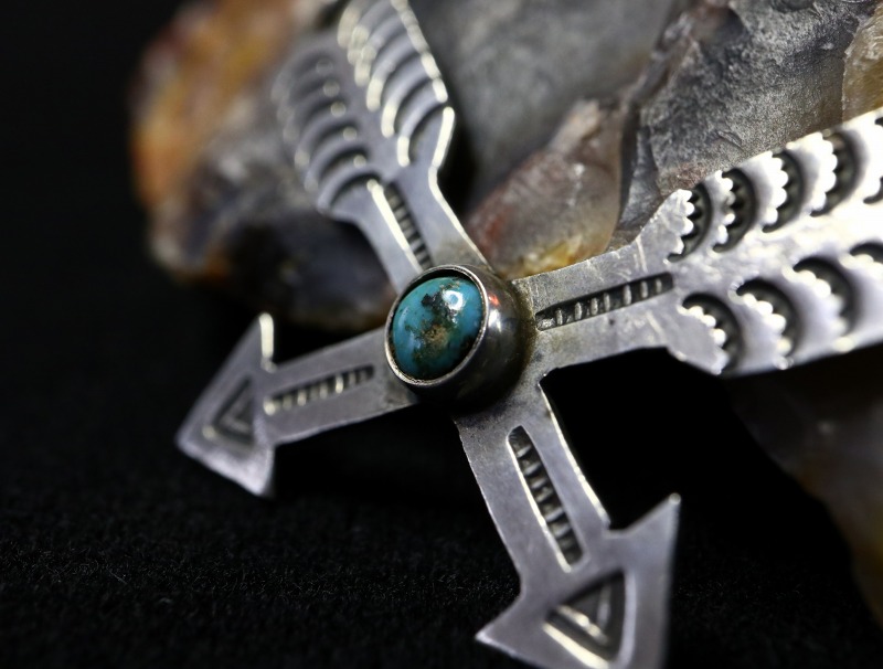 UITA21のホールマークや作品のディテールなどから、1940年代後半~1950年代に制作されたものと思われ、おそらくインゴット(銀塊)から成形され全てのディテールがハンドメイドの丁寧なシルバーワークによって仕上げられています。クロスアローのシェイプも量産化されたピースのようにプレス機で切り抜かれたものではなく、丁寧な手作業によるカッティングワークによって切り出されており、僅かな制作ムラも見られますが大変味わい深い表情となっています。さらに、全体に細かくも力強いスタンプワークによって細部の描写が刻み込まれており、センターには小さなラウンドカットターコイズがマウントされています。
