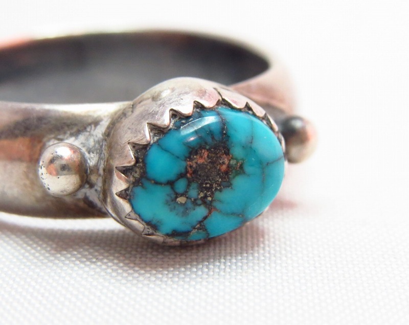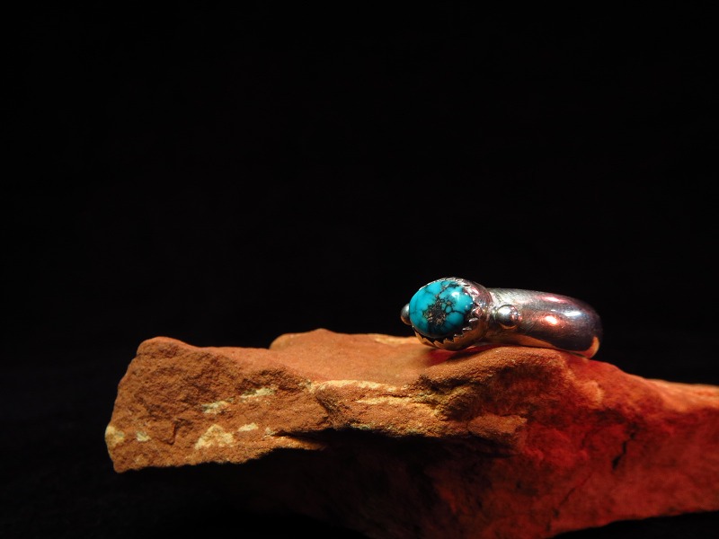 丸みと厚みのあるシャンクに美しいターコイズ、サイドには小さなシルバーボールが配されています。 とてもクリーンで洗練されたデザイン、ターコイズは澄んだ青に黒、ブラウンのマトリックス、僅かにパイライトの入る石でおそらくキングマンターコイズと推測されます。小さな石ですが、複雑な景色を見せる大変グレードの高いジェムクオリティーターコイズです。