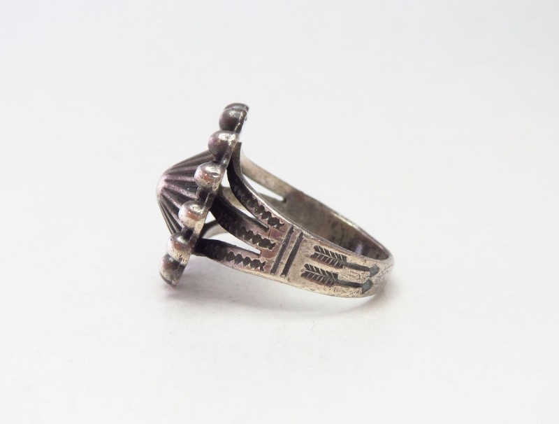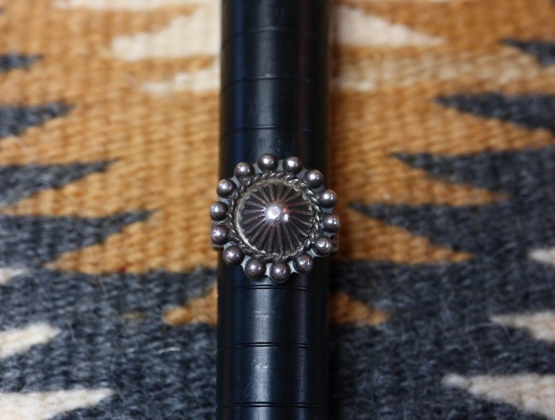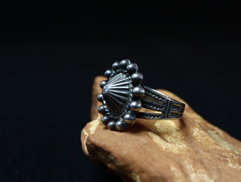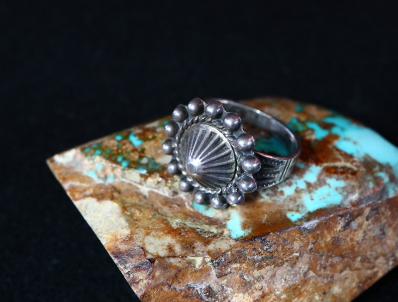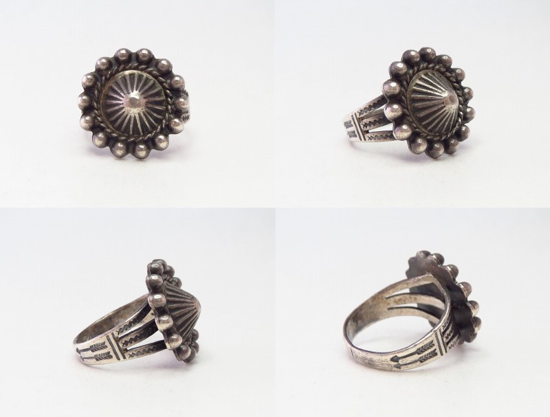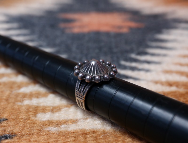 【NAVAJO】ナバホか【PUEBLO】プエブロの職人による作品で、【Tourist Jewelry】ツーリストジュエリーと呼ばれる20世紀前半頃にアメリカ中西部の観光客向けに制作されたスーベニアアイテムの一つ。伝統的な技術によるハンドメイド作品で、シェルコンチョがフェイスに構成された素朴ながら存在感のあるアンティーク/ビンテージリングです。