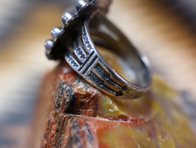 また、シャンクには全体にアローモチーフ等のスタンプワークが刻まれることでナバホジュエリーらしい表情が与えられており、ボリューム感のあるコンチョデザインのフェイスと素晴らしい相性を見せています。