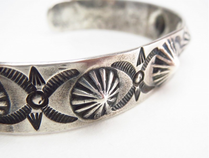 1920年代後半~1930年代製と思われる作品で、インゴットシルバー(銀塊)から成形されたと思われるバンド/地金は、 日本で『平打ち』と呼ばれるシェイプに造形されています。そこに、鏨(鉄製の金型ツール)を用いてシルバーを叩きだすことで作るシェルコンチョのリポウズ/バンプアウトが連続して施されることでスタッズデザインの様な立体的でワイルドな印象が与えられています。また、本作で使用されている鏨ツールは、現代の様な凸と凹の金型で挟み込むタイプではなく、まだ凹の金型に矢坊主(メタルダッピングツール)を用いて叩きこんでゆくことで形作られたディテールとなっています。