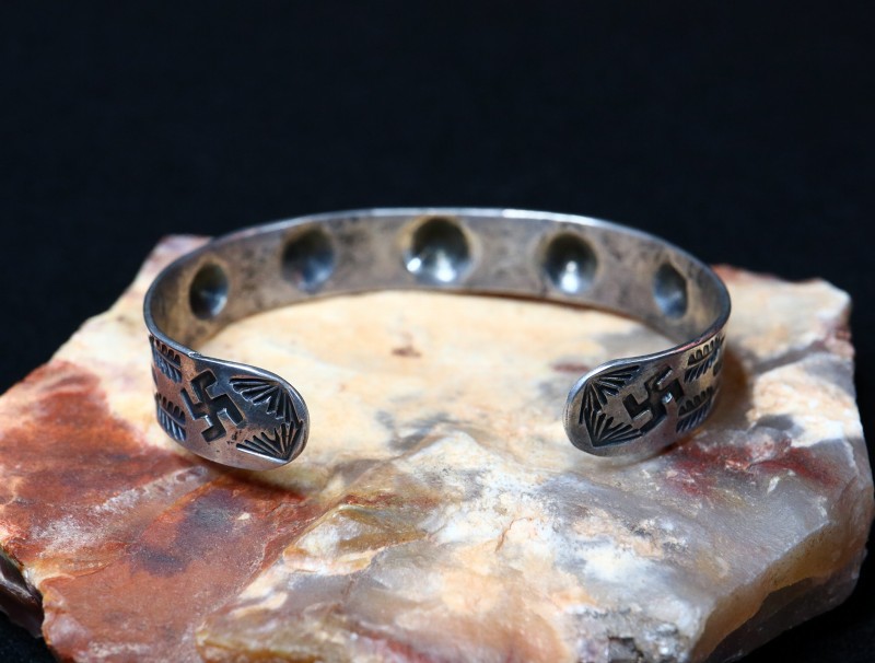 【NAVAJO】ナバホのアンティークジュエリー、インゴットシルバー(銀塊)から成形されたバンド/地金にシェルコンチョ(貝殻がモチーフ)のリポウズが羅列され、スタッズブレスレットの様に造形された作品。ターミナル(両端)付近には【逆卍】Whirling Log等の力強いスタンプワークも施されたピースで、全てハンドメイドで制作されたアンティーク/ビンテージバングルです。