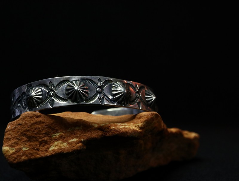また、それらリポウズの間には力強いスタンプワークが刻まれ、サイド~ターミナルにはアローや卍のスタンプが配されることでアンティークナバホジュエリーらしい雰囲気に仕上がっているようです。