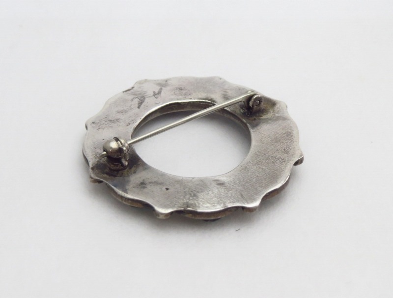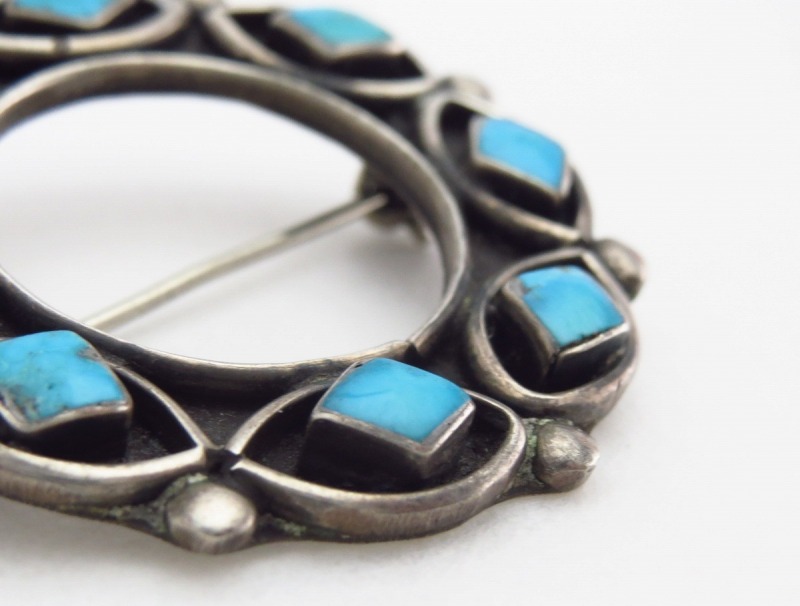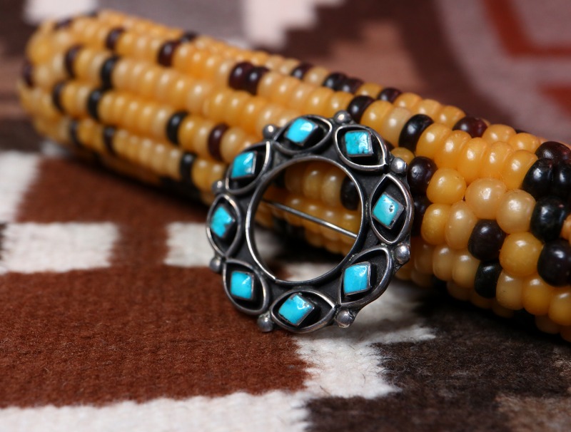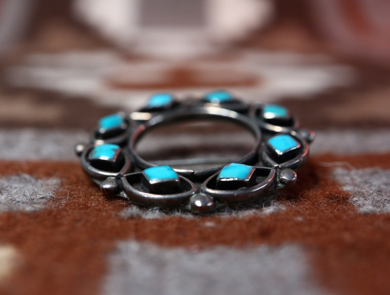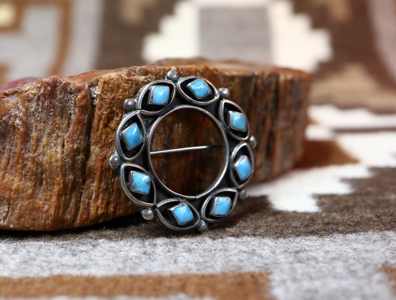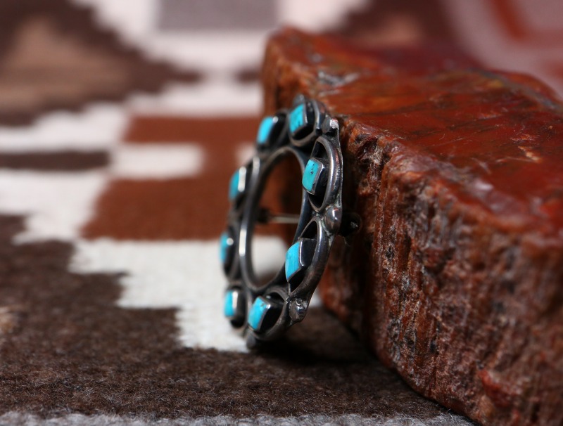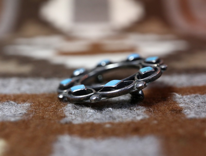 【ZUNI】ズニのビンテージジュエリー、ウィール/サークル型のシルバーをベースに、ズニの伝統的なディテールであるワイヤーワークとターコイズインレイによって形作られた作品。とても使いやすい印象を持ったアンティーク/ビンテージピンブローチです。