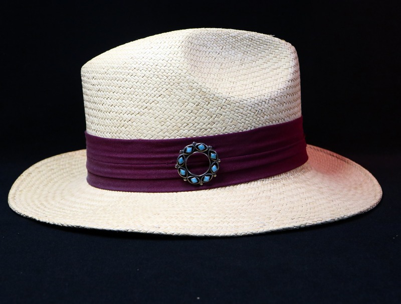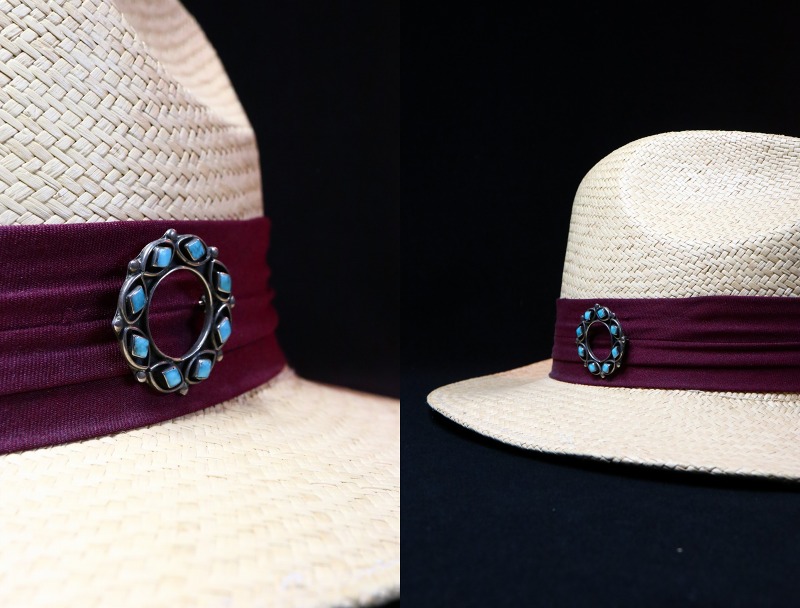 洋服やハットなどに装着すると、ピンブローチのニードル(針)が隠れるため、ターコイズが並んだ綺麗なウィールシェイプが現れます。