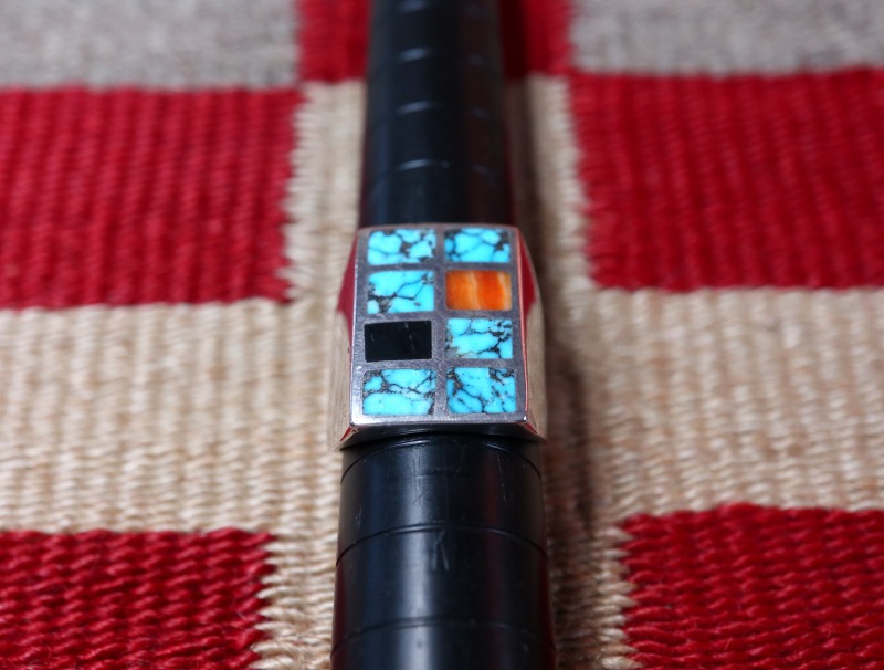 1970年代後半以降に作られた作品と思われ、キャストで成形された重厚なベースにスクエアのフェイスが構成されています。そのフェイス部分は格子状に8分割され、美しいターコイズやオレンジ色のスパイニーオイスター、そして黒いジェットが螺鈿細工のようにピッタリとセットされています。このようなインレイワークを用いたモダンなスタイルのズニジュエリーは、1940年代頃から見られるものですが1960年代後半~1980年代にかけて多く制作されました。