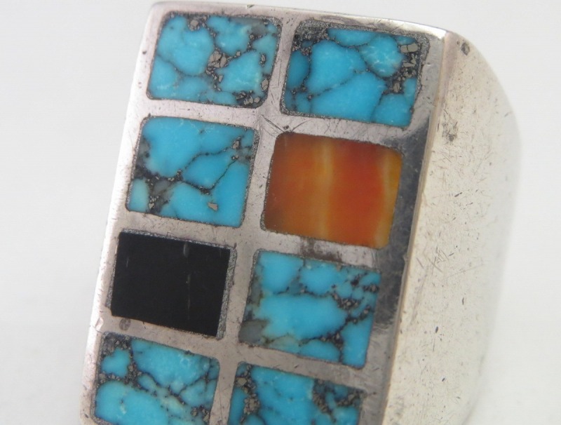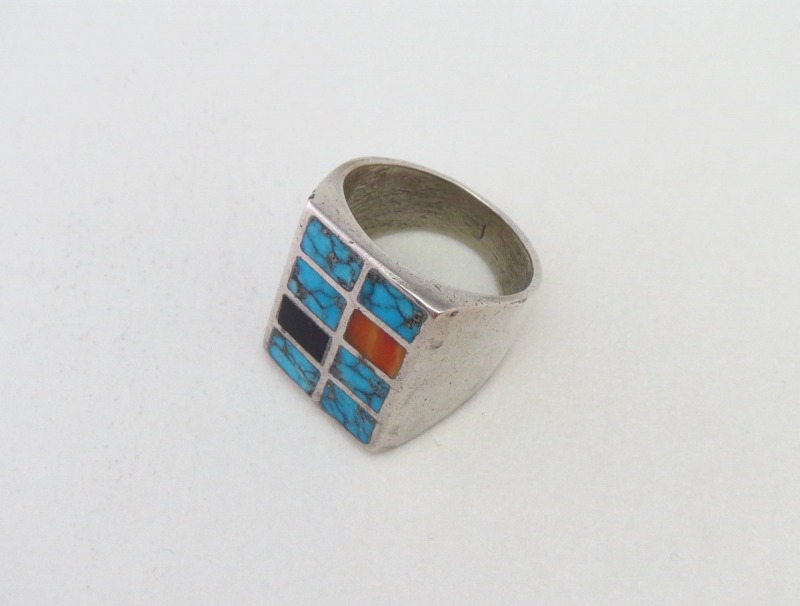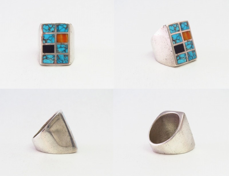 【ZUNI】ズニのオールドジュエリー、チャンネルインレイによりターコイズやスパイニーオイスター、ジェットがはめ込まれたスクエアフェイスが特徴的なシールリング/印台型タイプのアンティーク/ビンテージリングです。