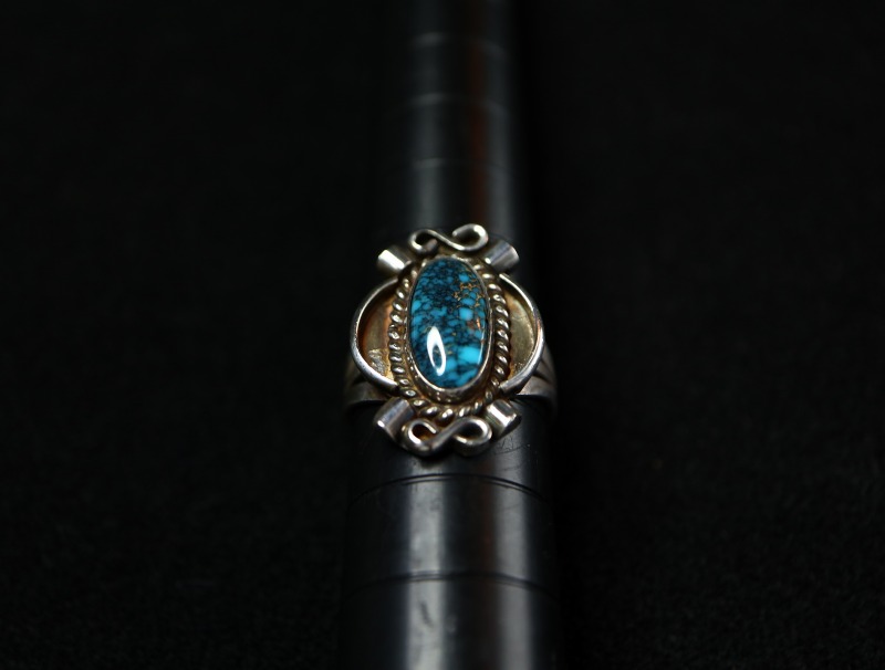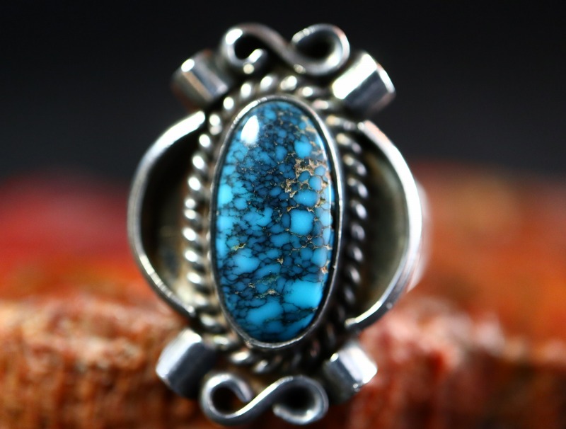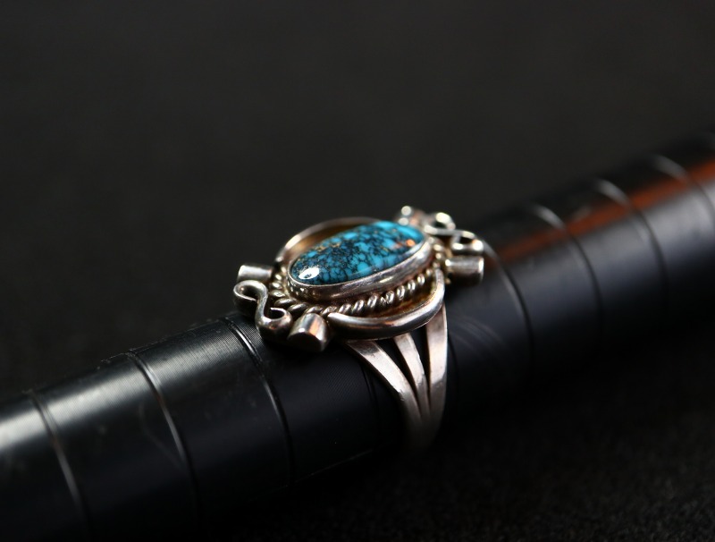 また、ナバホジュエリー独特の武骨な雰囲気も持っていますが、流麗で細かなシルバーワークによってクラシックでアーティーな魅力を宿しています。さらに、ハイグレードなターコイズによって上質でエレガントな印象も併せ持つ作品であり、フォーマルなシーンでも品格を損なわず普遍的な造形美は多くのスタイルにフィットするリングです。