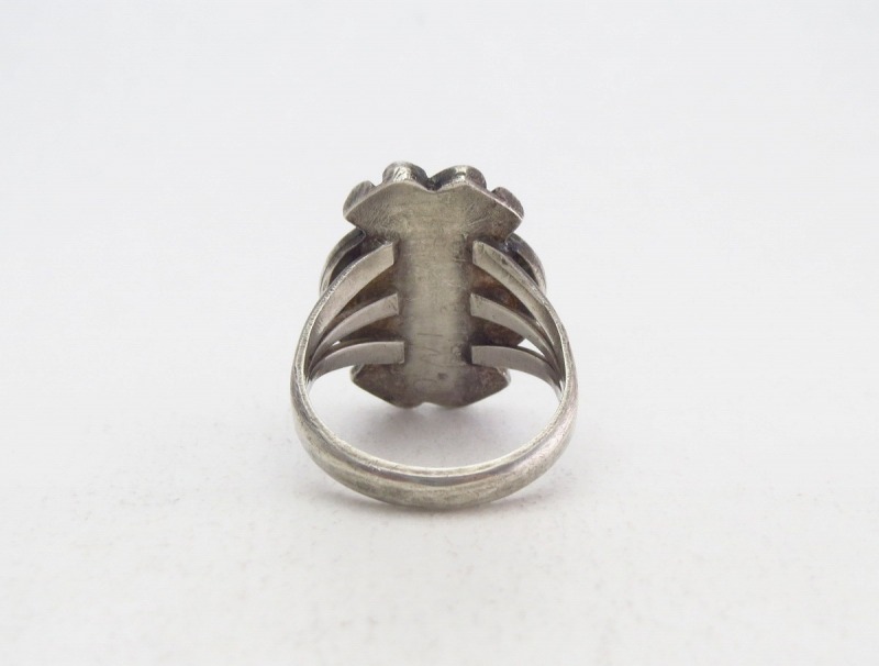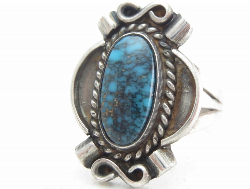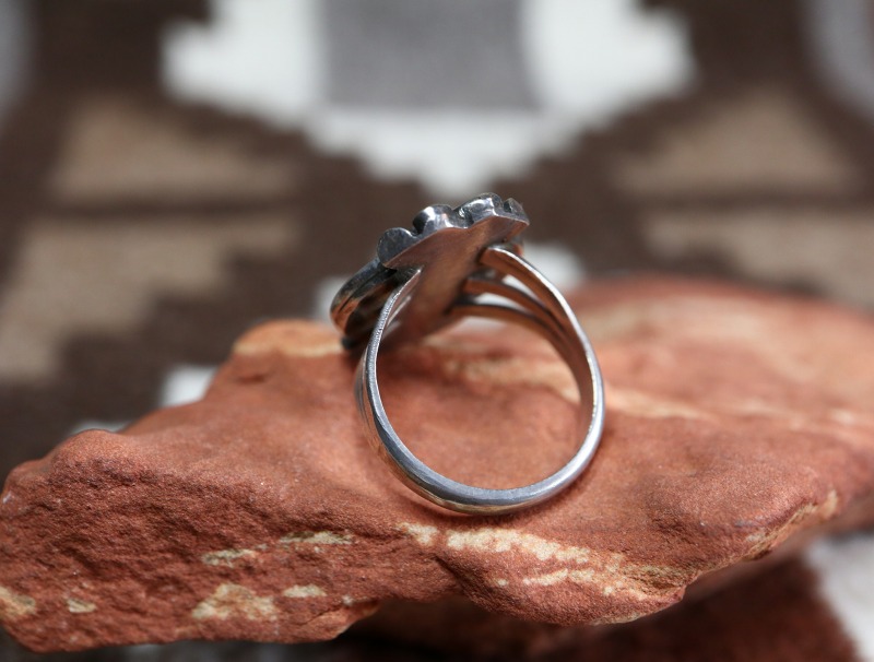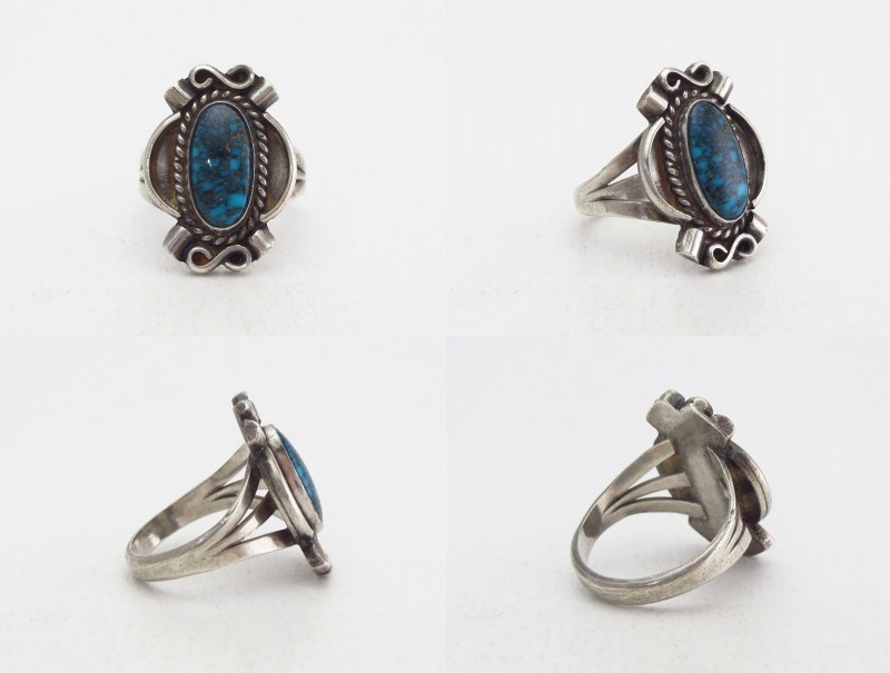 1940年代~1950年代頃の作品と思われ、おそらくインゴットシルバー(銀塊)から成形されたシャンクは、フロントが『スプリットシャンク』と呼ばれる伝統的な造形で3本に割り開かれており、フェイスに向かって幅とボリューム感を持たせた造形スタイル。フェイスは美しいターコイズを中心に、ベゼル(覆輪)にはツイステッドワイヤーが施され、さらに手の込んだワイヤーワークによる装飾が見られます。それらシルバーワイヤーによる繊細で流麗な装飾があしらわれることで複雑で深遠な表情を持つターコイズの質を高めているように感じされる作品となっています。