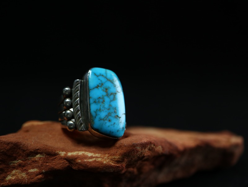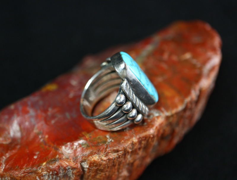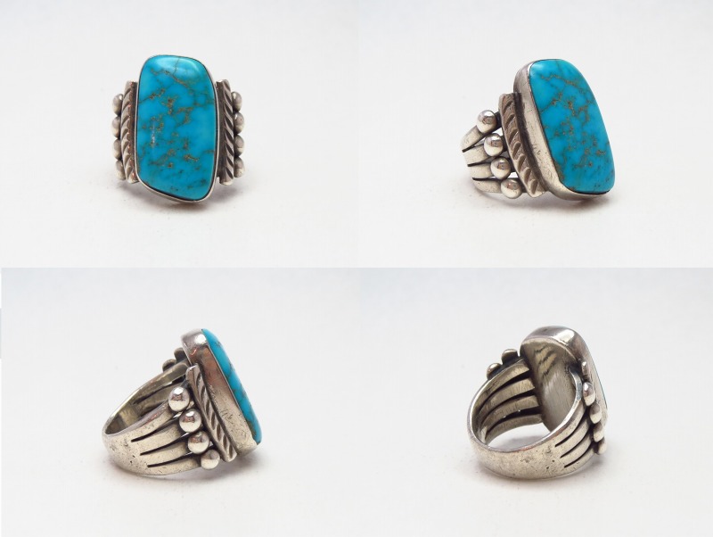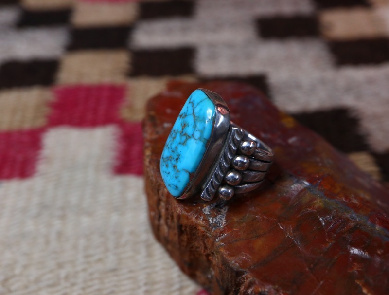 1930年代~1950年代頃までに作られたものと思われ、インゴットシルバー(銀塊)より成形されたシャンク(地金)は、とても美しいシルバーワークによって4本に割り開かれた『スプリットシャンク』と呼ばれるナバホの伝統的なスタイルに造形されています。そこに長方形のような独特のシェイプにカットされ、高さもあるターコイズがマウントされています。また、そのベゼルとシャンクとの間にはスタンプワークの刻まれたワイヤーが施されており、少し大きめのシルバーボールも配されることで、奥行きとバランスの良い立体感が与えられています。それらのシルバーワークは、全て古いナバホのディテールで構成され、地金のシルバーは厚ければ厚いほどその加工には高い技術が必要とされる為、とても丁寧で質の高いシルバーワークによって構成されたクラシックな印象のリングです。