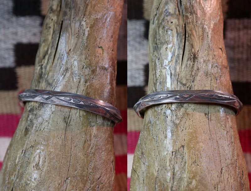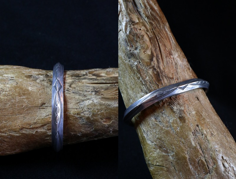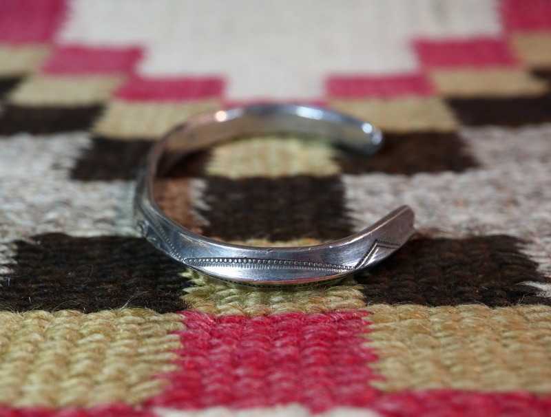また、こちらのような年代に制作されたトライアングルワイヤーのバングルは現存数が少なく、コレクターの手を離れることも少ないため、大変貴重なのアンティークナバホジュエリーの一つとなっており、トレジャーハントプライスな作品です。