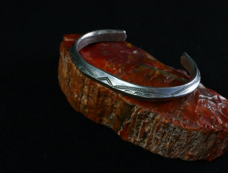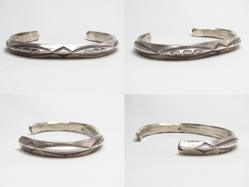 1910年代後半~1930年代頃に制作されたピースと思われ、重厚でアンティークらしい質感や味わい深いスタンプワークが特徴的なピースです。現代においてもナバホのオーセンティックなスタイルの一つとしてトライアングルワイヤーをベースにした作品は数多く制作されていますが、こちらの作品は現在制作されている作品群のソース/源流となったピースであり、そのプリミティブな製法は、既製のトライアングルワイヤーを使った現代の作品群とは違った表情や迫力を持っています。