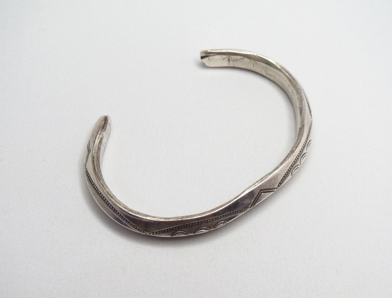 【NAVAJO】ナバホのアンティークジュエリー、インゴットシルバー(銀塊)から成形された硬く重厚なトライアングルワイヤー(竜骨型)をベースに、プリミティブで力強いスタンプが施されたとても古いアンティーク/ビンテージバングルです。