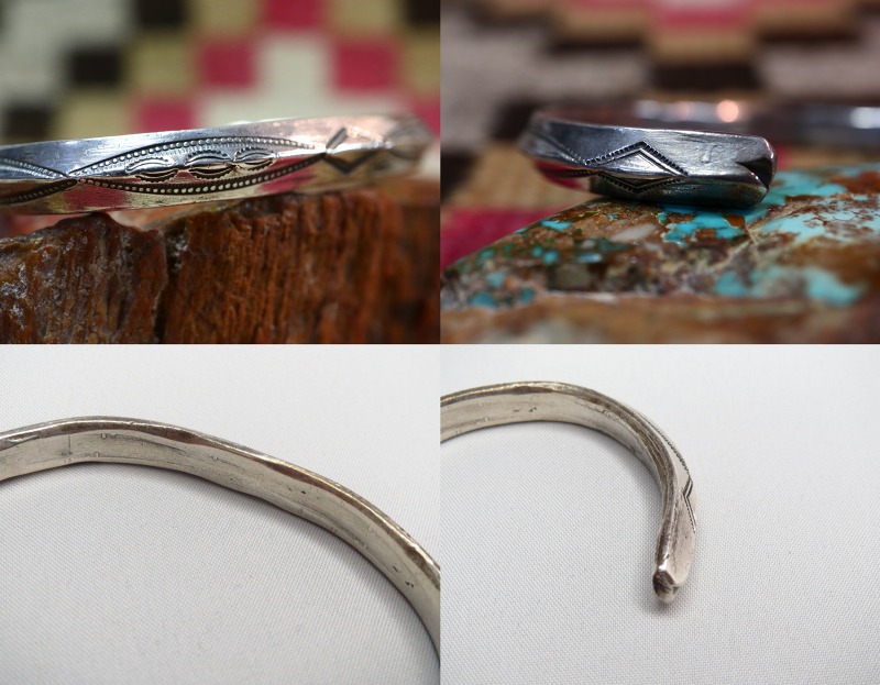 ベースとなっているトライアングルワイヤー(竜骨型)は、インゴットシルバー(銀塊)をトライアングル型に彫り込んだ溝にハンマーで叩きこんで成形するナバホの伝統的製法により、とても硬く重厚に造形されています。それにより、既製のトライアングルワイヤーに比べ独特な断面のシェイプを持ち、ターミナル(両端)にかけて少し細くなるように造形され、上下のエッジは少しフラットに削られています。これらのようなディテールは、1900年代~1920年代に多く見られるスタイルであり、さりげないディテールながら既成のワイヤーを使用した作品には見られないアンティーク作品独特のディテールとなっています。また使用されているスタンプ(鏨)ツール自体も非常に細かな仕事による高い完成度を持ち、こちらのようなアンティーク作品特有のクオリティーを感じさせます。