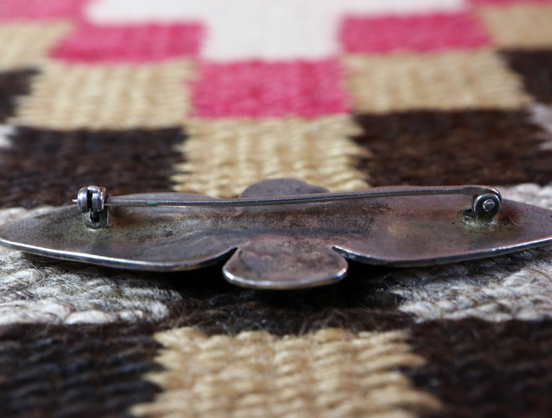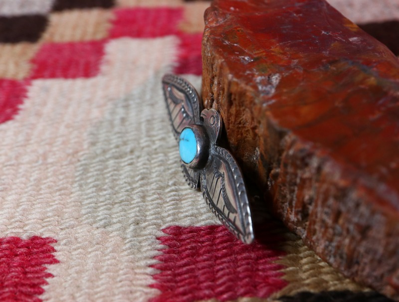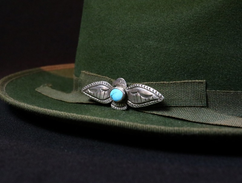 キャッチーな印象を持つサンダーバードモチーフですが、インゴット(銀塊)から成形された地金や武骨なスタンプワークなど、ナバホの伝統的な技術やハンドメイドの味わいが感じられるピースです。また、量産された同様のデザインを持つピンに比べるととても厚くしっかりとしたシルバーがベースになっており、ハンドクラフト独特の味わいと威厳を感じることが出来ます。特に、ターコイズのベゼル(覆輪)は、ハンマーワークで造形された分厚いシルバーとなっており、1920年代以前の作品のようなディテールとなっています。